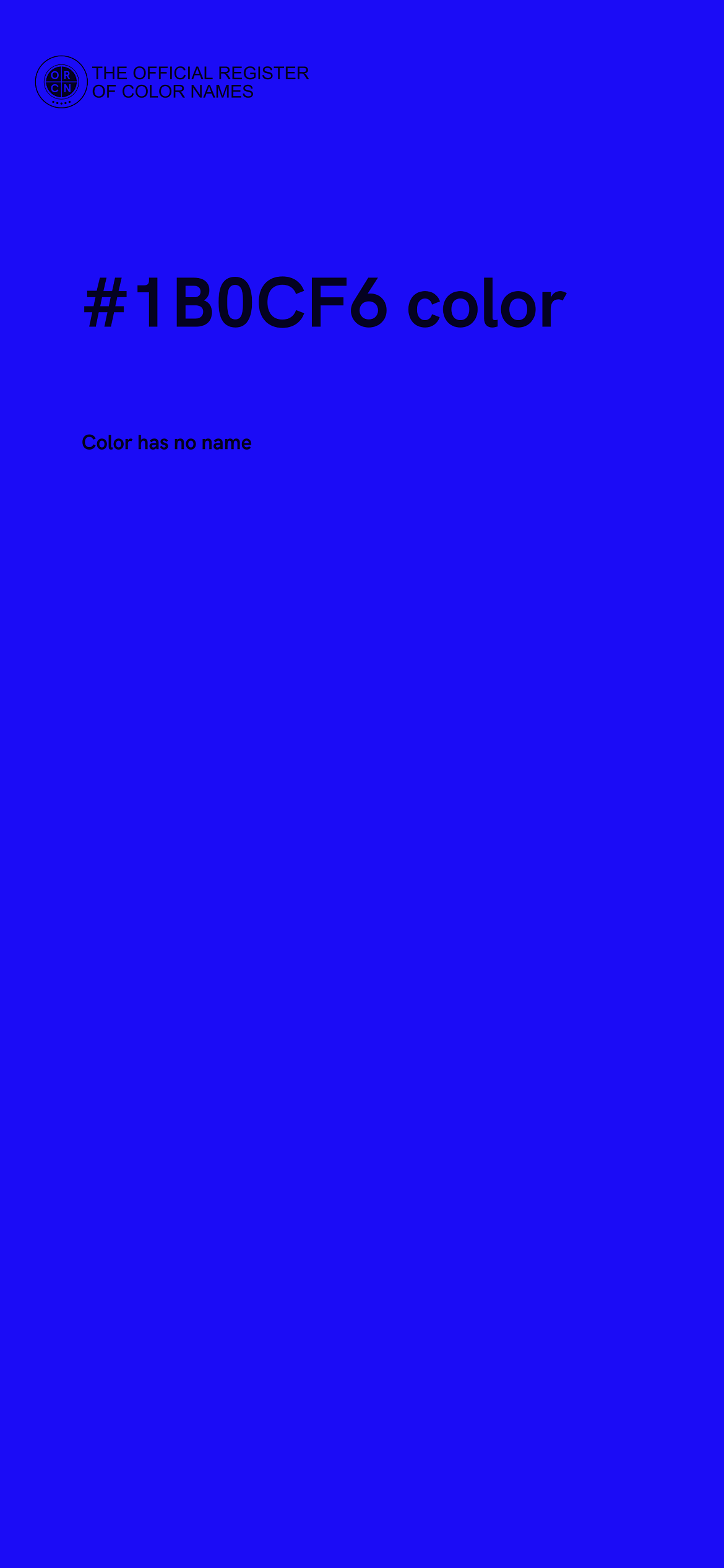 The digital color HEX #1B0CF6 belongs to the Blue Color Family featuring Full Saturation (Saturation Family) and Light (Brightness Family).