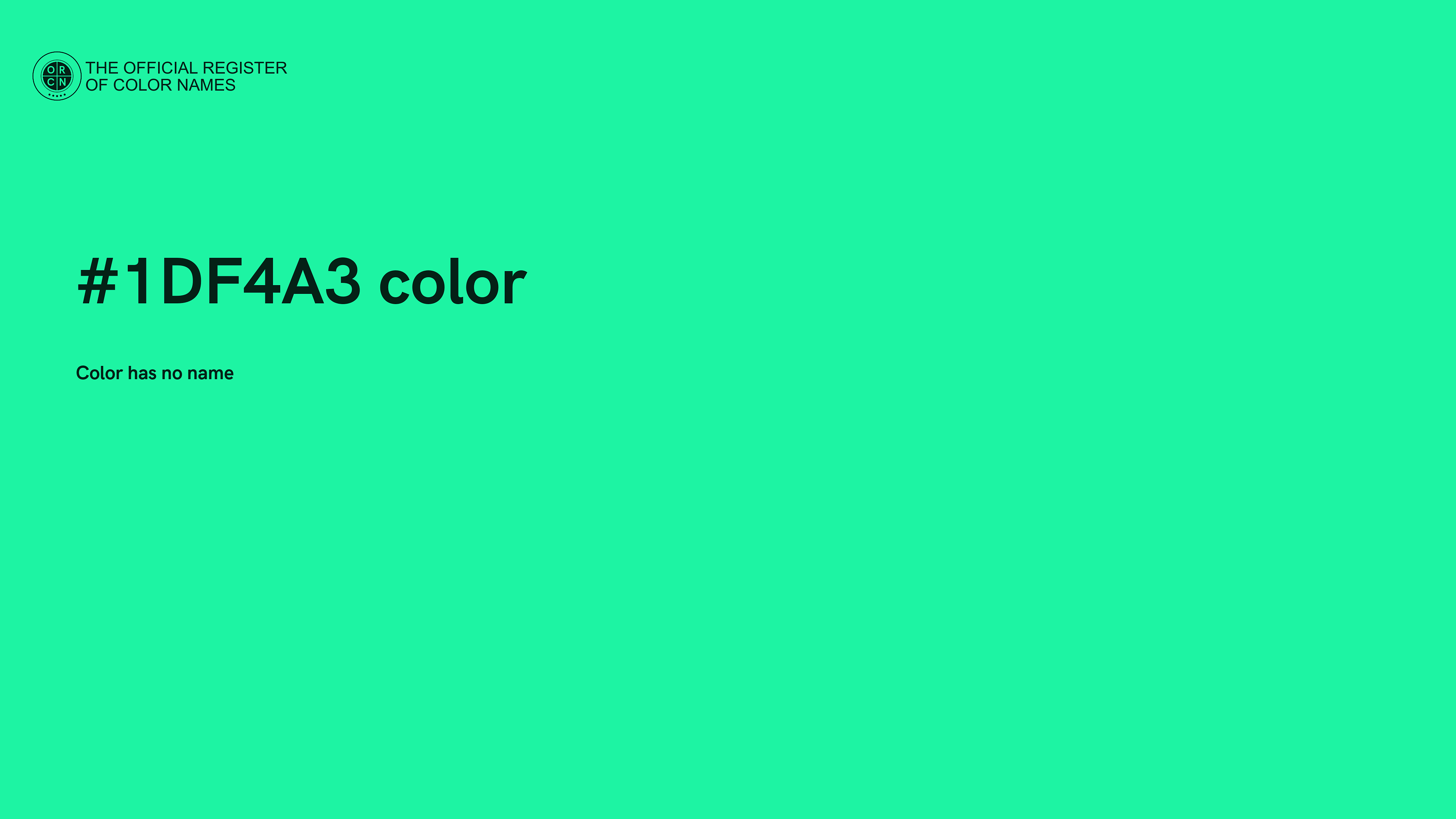 The digital color HEX #1DF4A3 belongs to the Spring Green Color Family featuring Full Saturation (Saturation Family) and Light (Brightness Family).