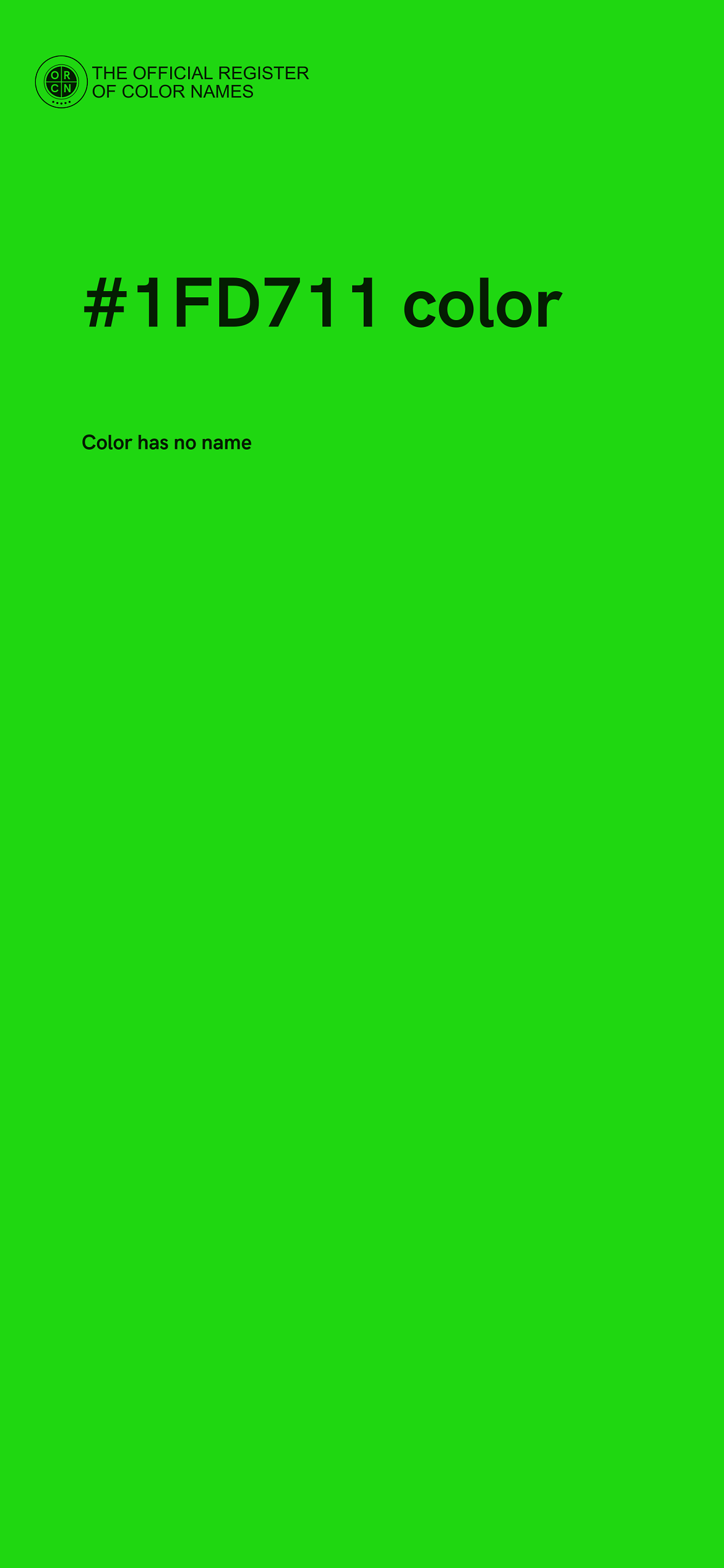 The digital color HEX #1FD711 belongs to the Green Color Family featuring Full Saturation (Saturation Family) and Light (Brightness Family).