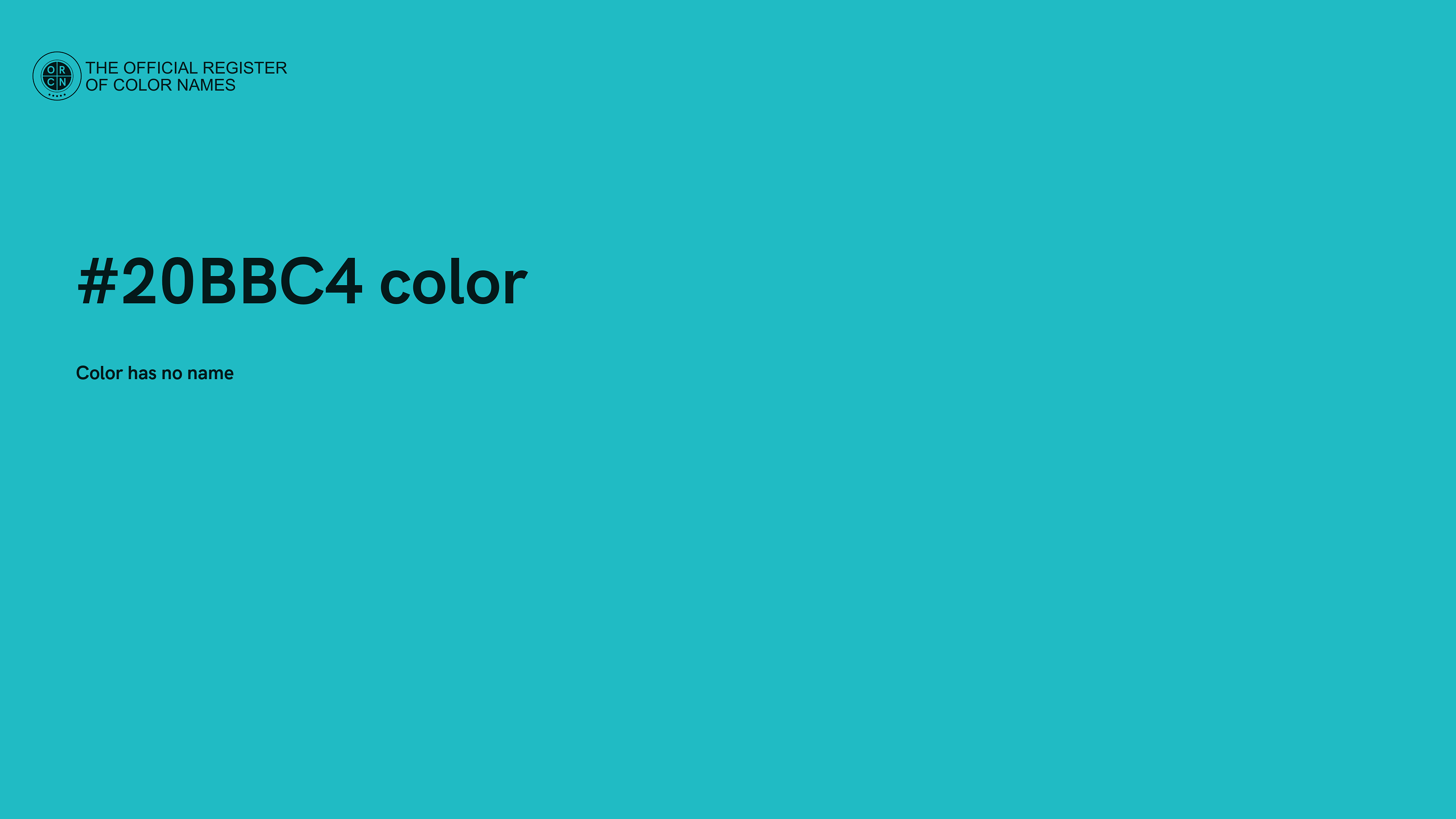 For printing in non digital world, #20BBC4 is represented in CMYK as 64 Cyan, 4 Magenta, 0 Yellow, and 23 Black (Key) (C:64 M:4 Y:0 K:23).