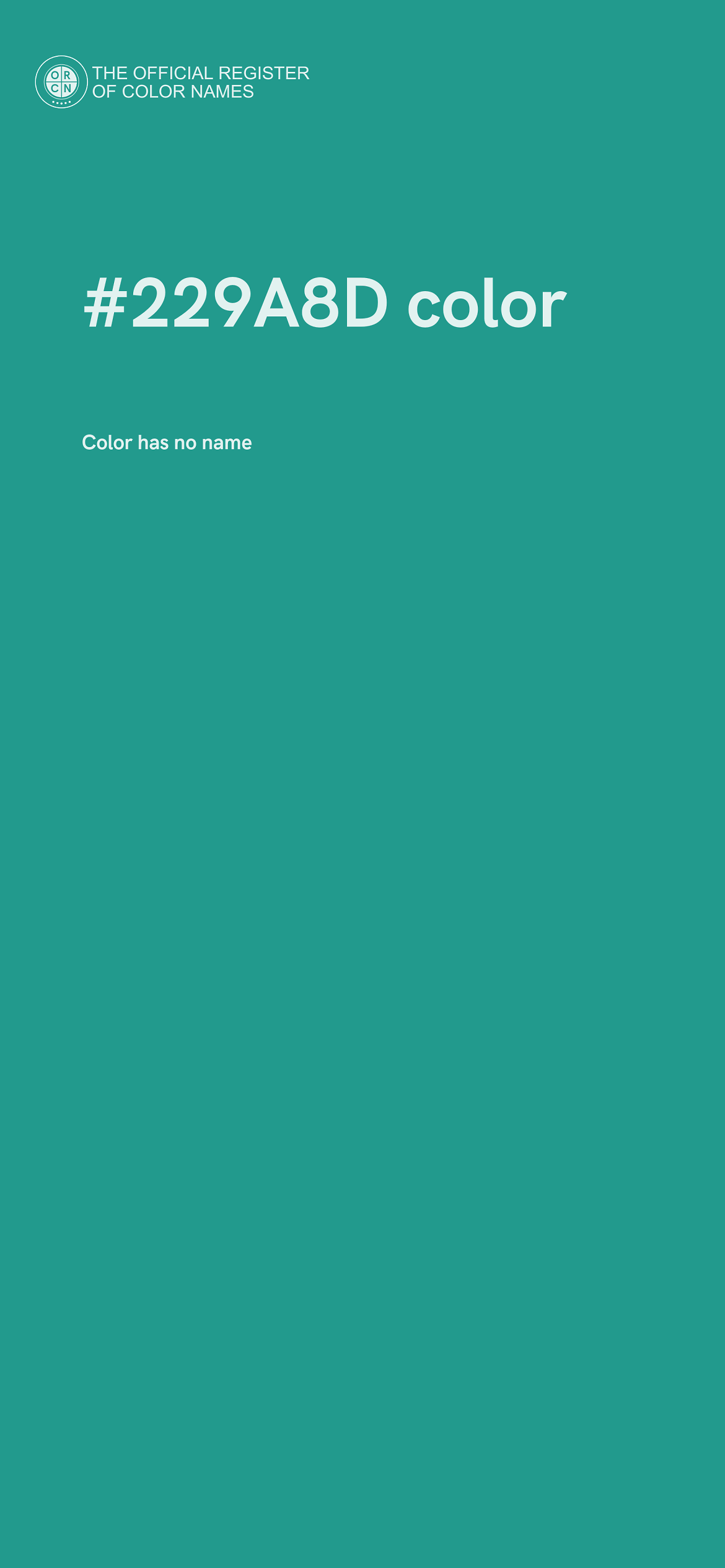 The digital color HEX #229A8D belongs to the Cyan Color Family featuring High Saturation (Saturation Family) and Neutral (Brightness Family).
