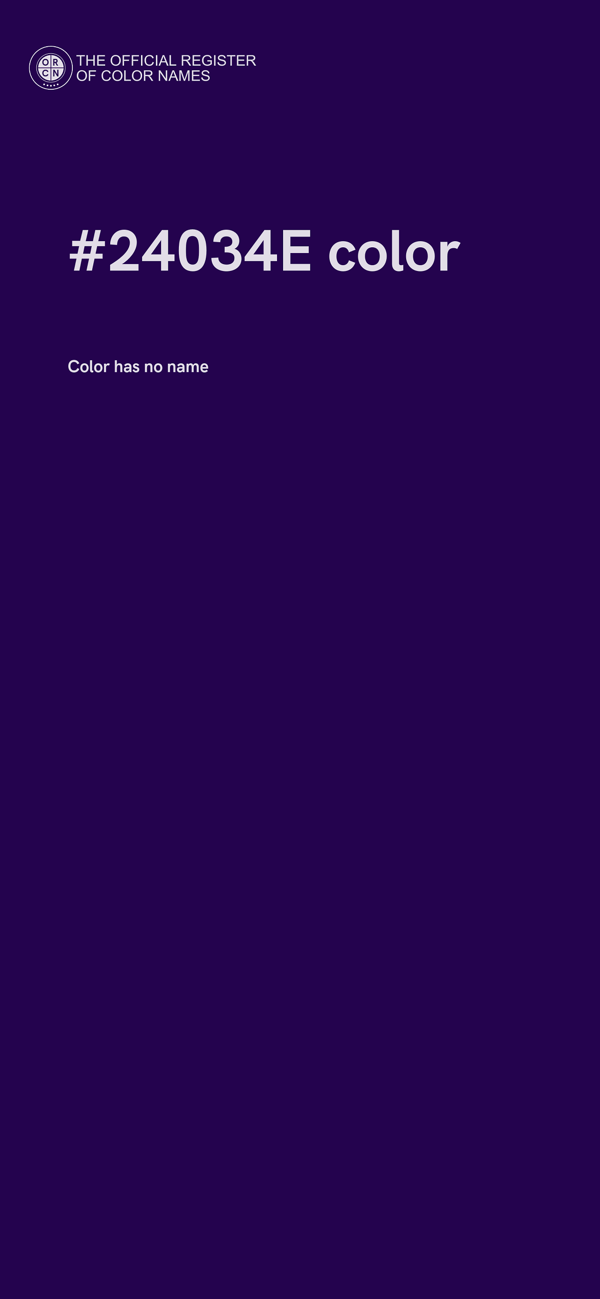 The digital color HEX #24034E belongs to the Violet Color Family featuring Full Saturation (Saturation Family) and Dark (Brightness Family).