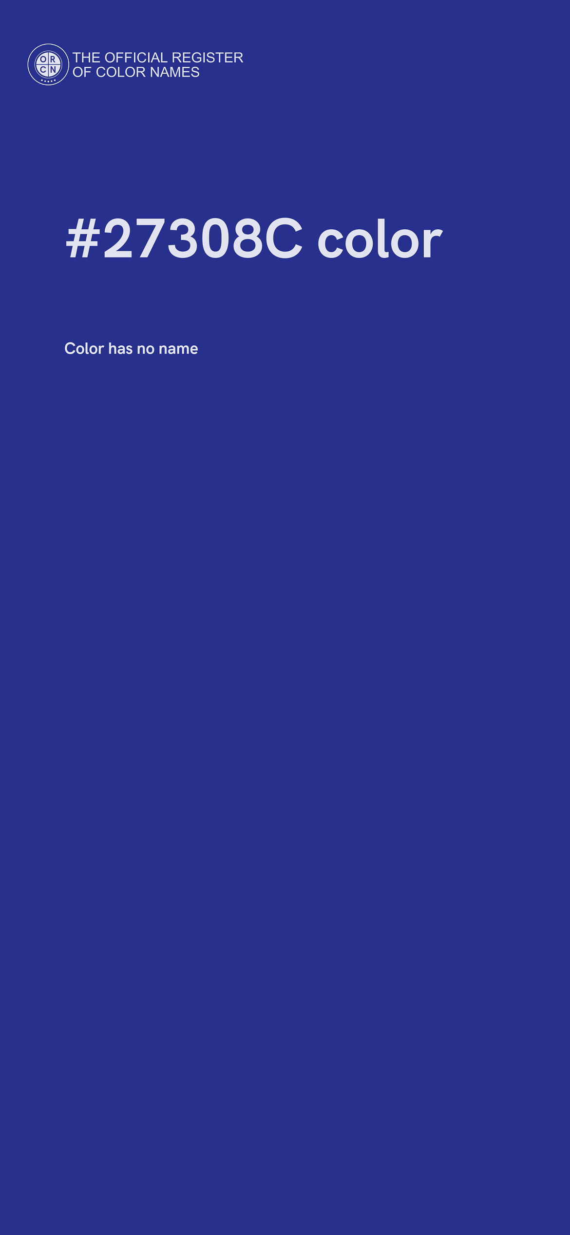 The digital color HEX #27308C belongs to the Blue Color Family featuring Moderate Saturation (Saturation Family) and Neutral (Brightness Family).