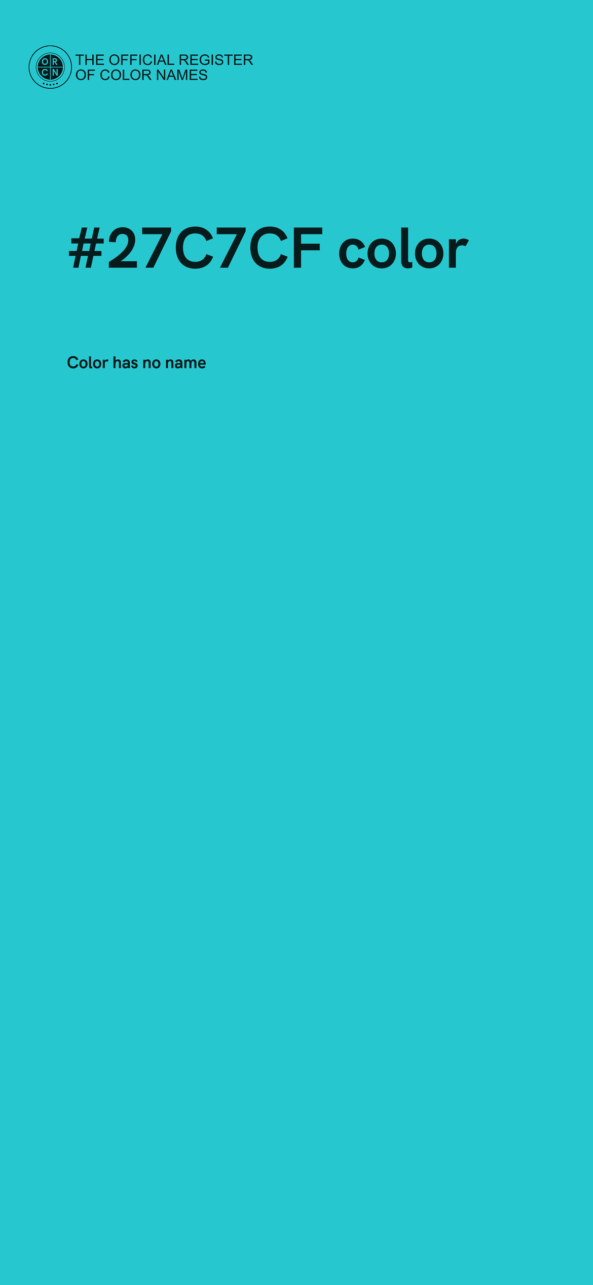 The digital color HEX #27C7CF belongs to the Cyan Color Family featuring High Saturation (Saturation Family) and Light (Brightness Family).