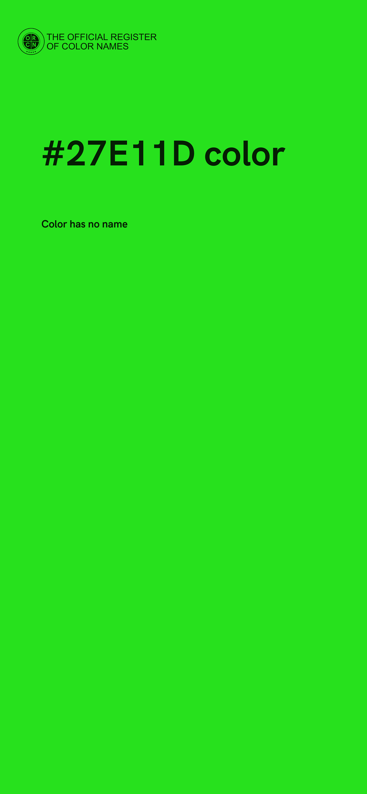 The digital color HEX #27E11D belongs to the Green Color Family featuring High Saturation (Saturation Family) and Light (Brightness Family).