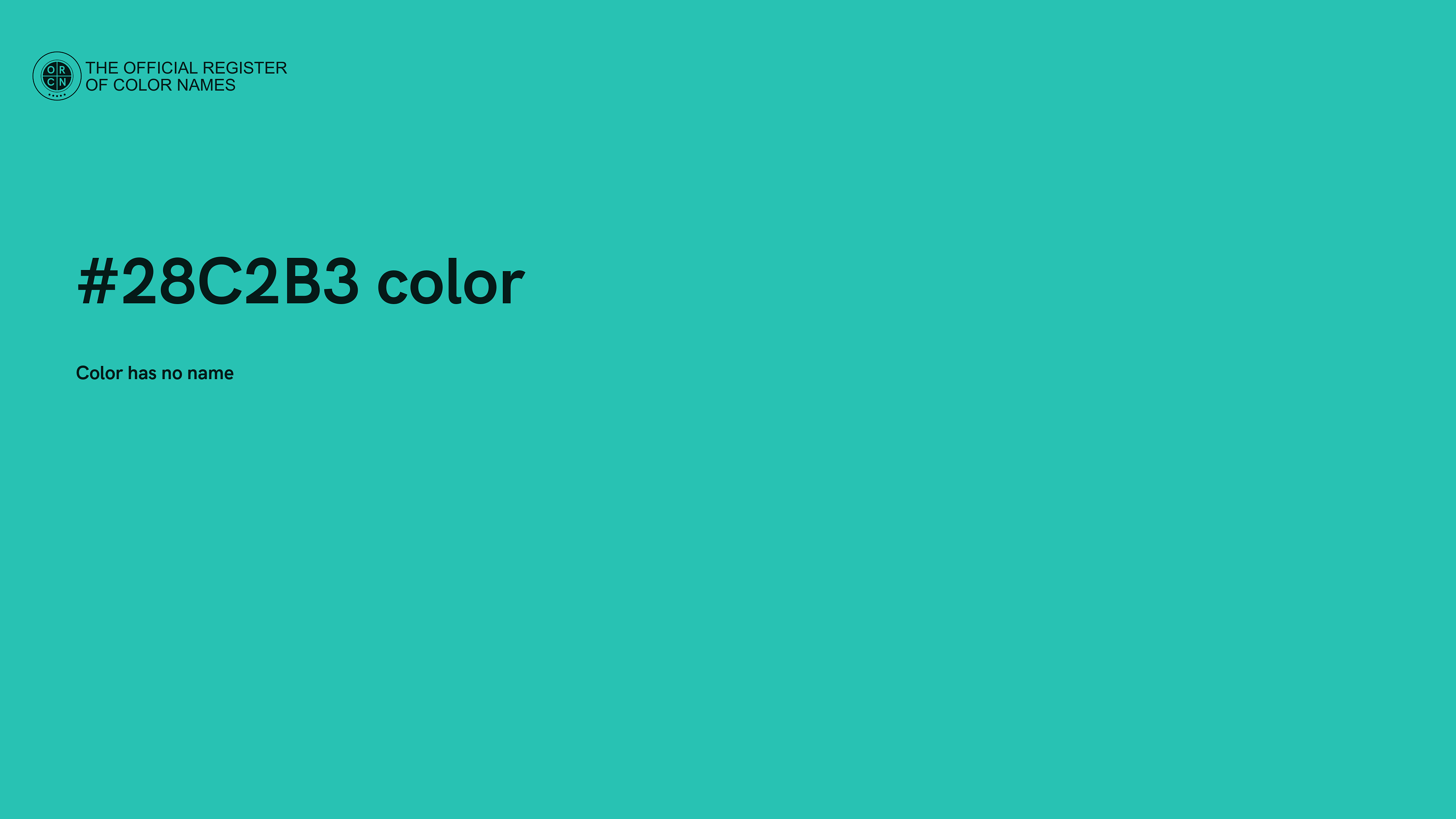 The digital color HEX #28C2B3 belongs to the Cyan Color Family featuring High Saturation (Saturation Family) and Light (Brightness Family).