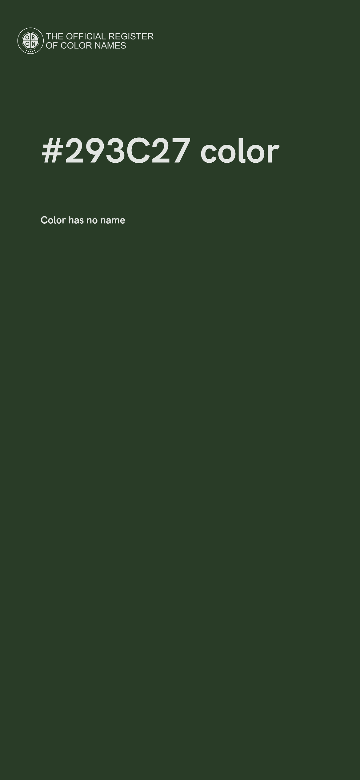 The digital color HEX #293C27 belongs to the Green Color Family featuring Low Saturation (Saturation Family) and Dark (Brightness Family).