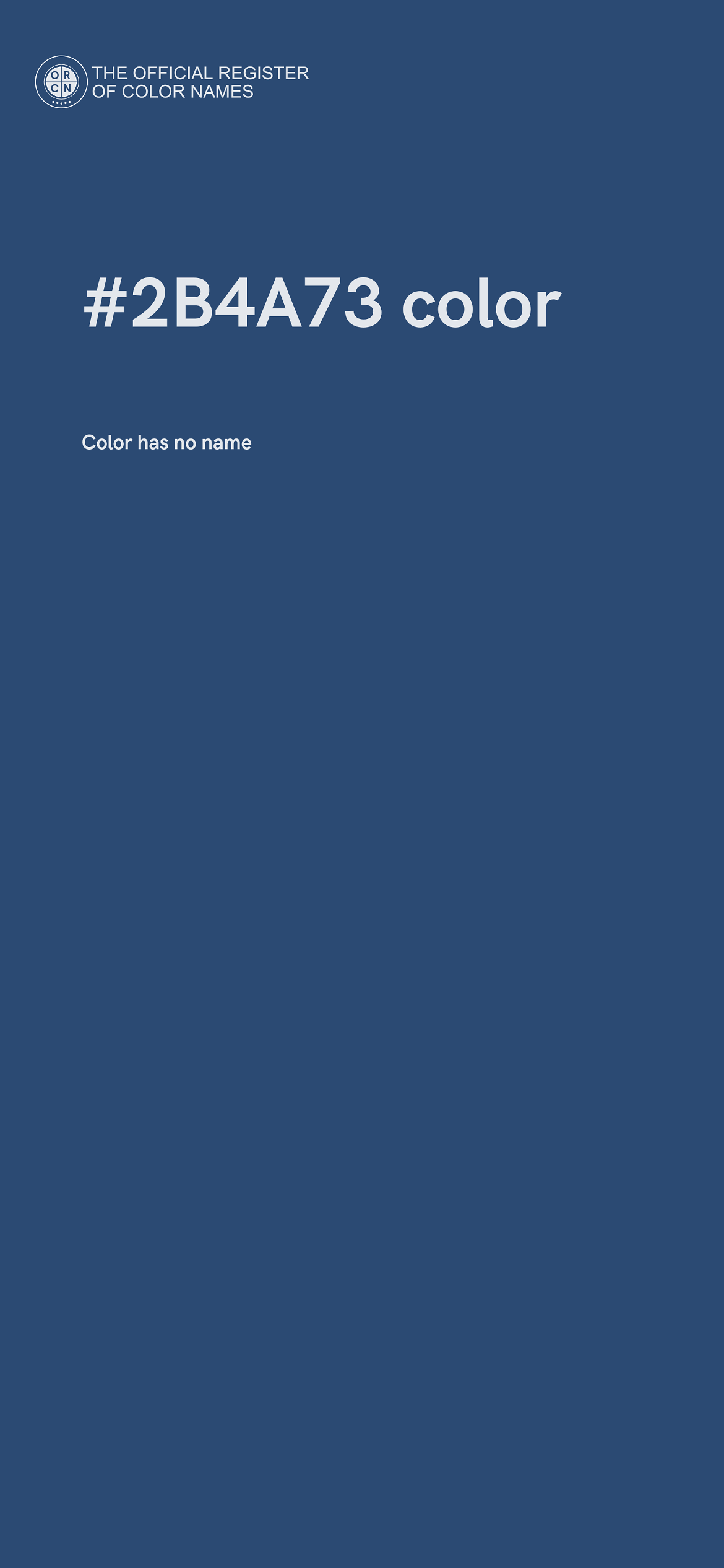 The digital color HEX #2B4A73 belongs to the Azure Color Family featuring Moderate Saturation (Saturation Family) and Neutral (Brightness Family).