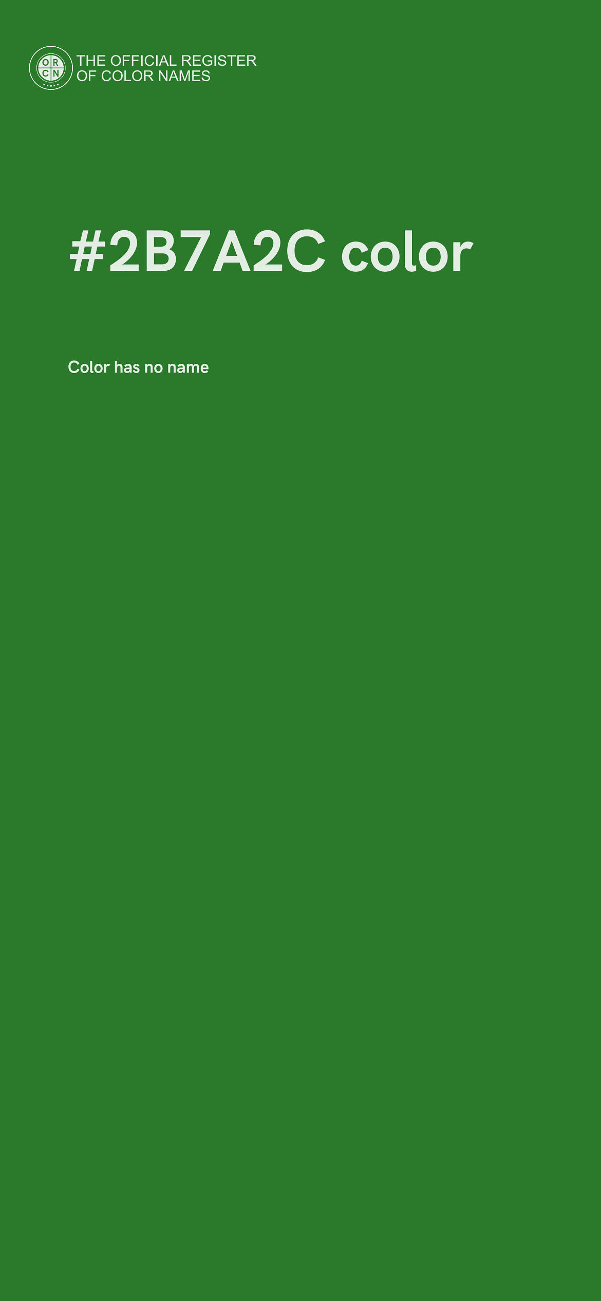 The digital color HEX #2B7A2C belongs to the Green Color Family featuring Moderate Saturation (Saturation Family) and Neutral (Brightness Family).