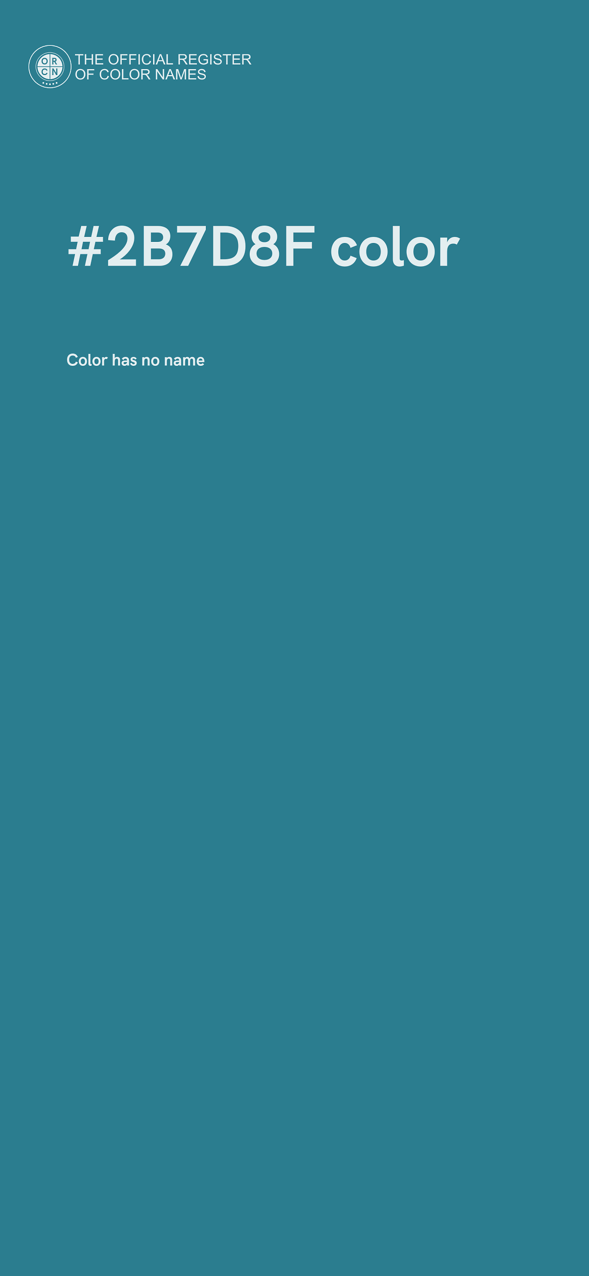 The digital color HEX #2B7D8F belongs to the Cyan Color Family featuring Moderate Saturation (Saturation Family) and Neutral (Brightness Family).