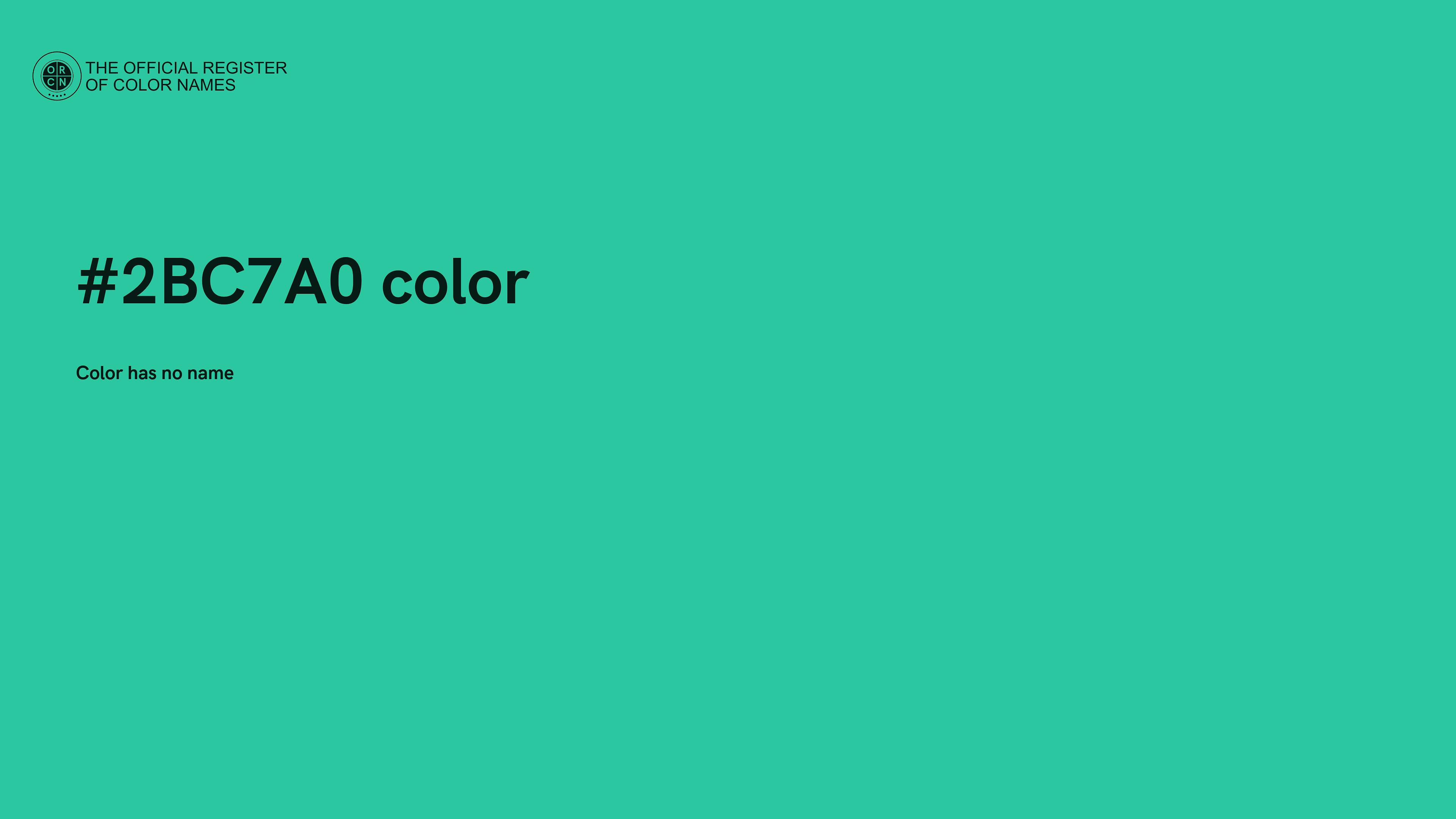 The digital color HEX #2BC7A0 belongs to the Cyan Color Family featuring High Saturation (Saturation Family) and Light (Brightness Family).