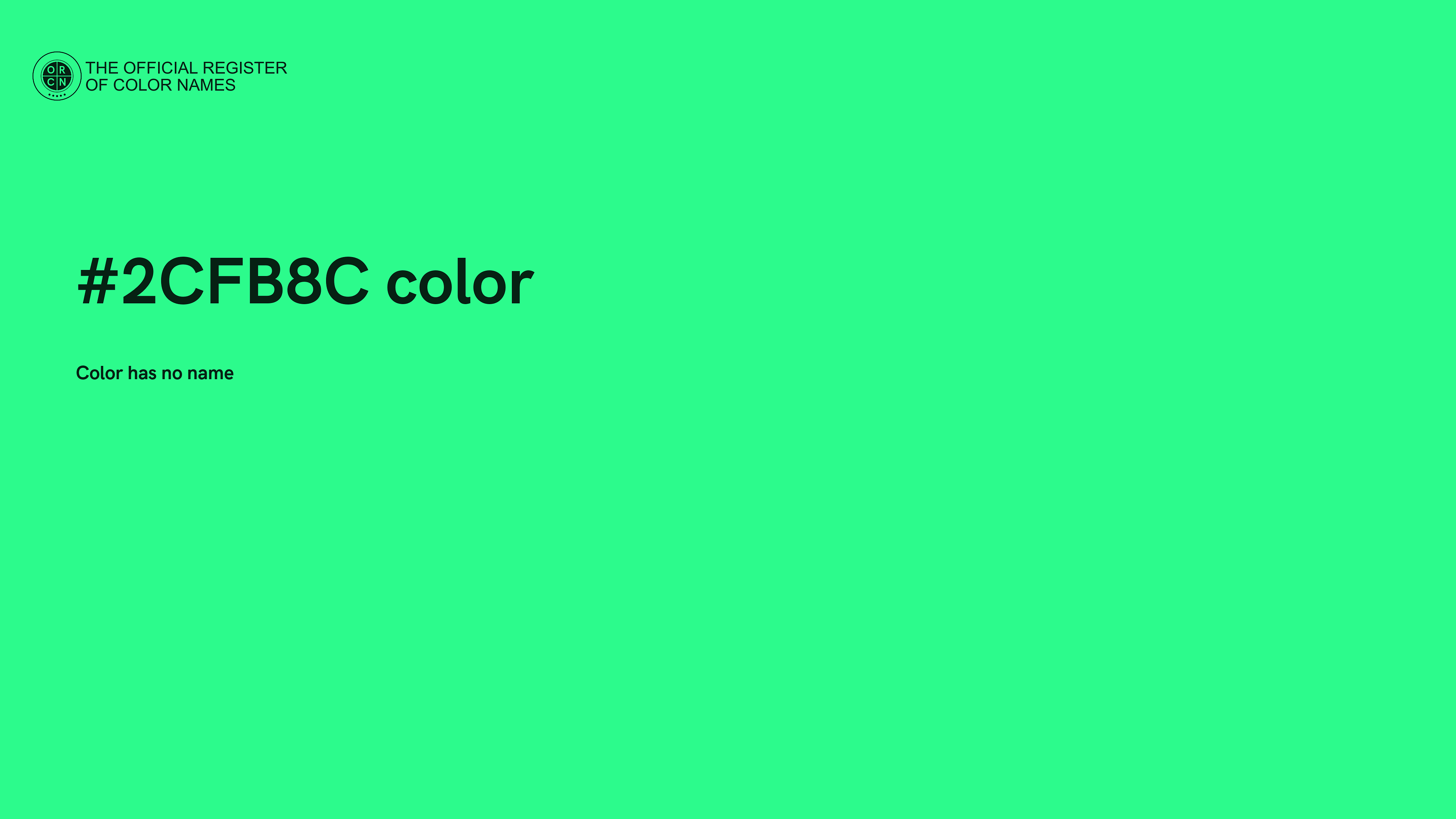 The digital color HEX #2CFB8C belongs to the Spring Green Color Family featuring Full Saturation (Saturation Family) and Light (Brightness Family).