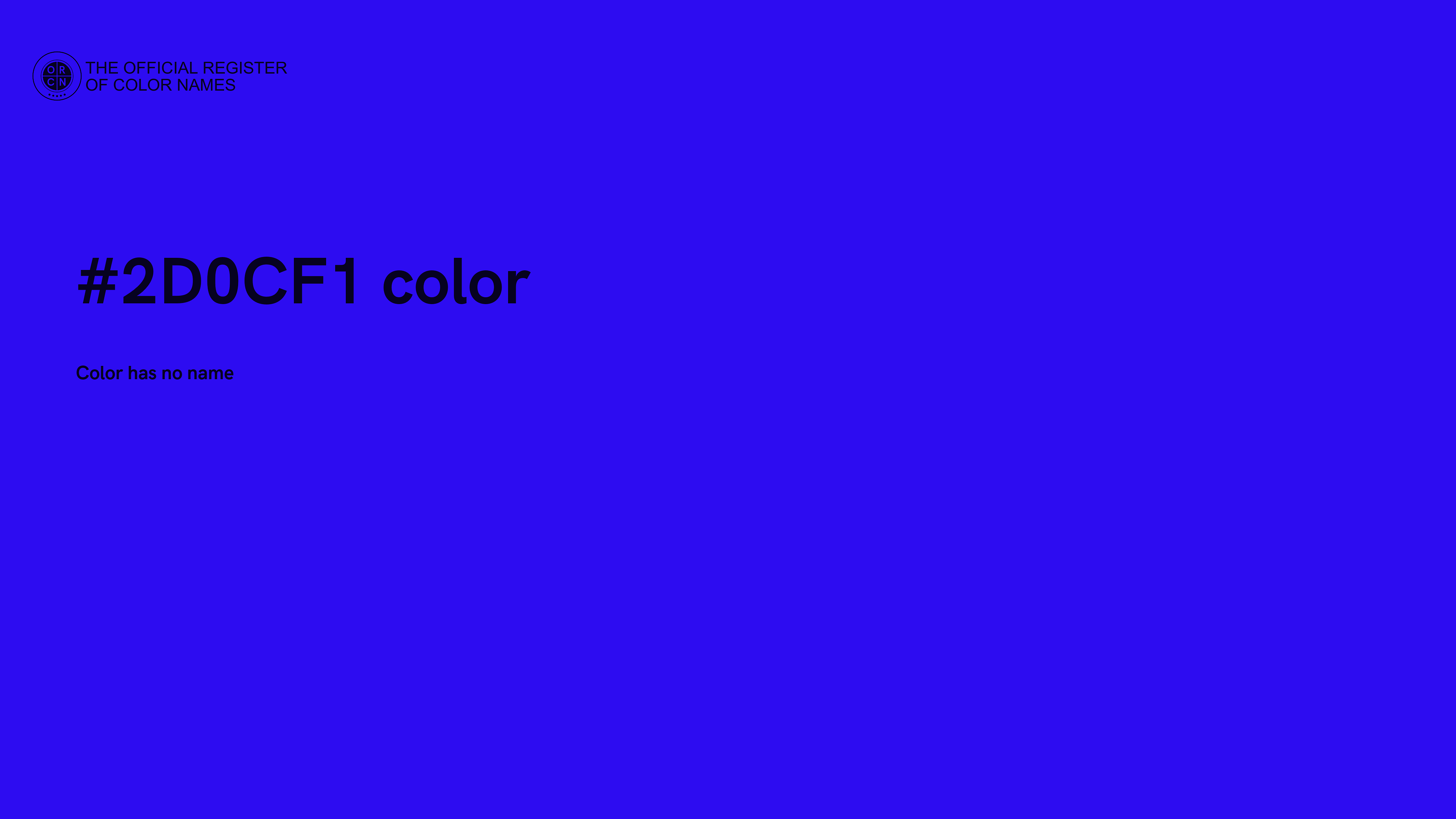 The digital color HEX #2D0CF1 belongs to the Blue Color Family featuring Full Saturation (Saturation Family) and Light (Brightness Family).