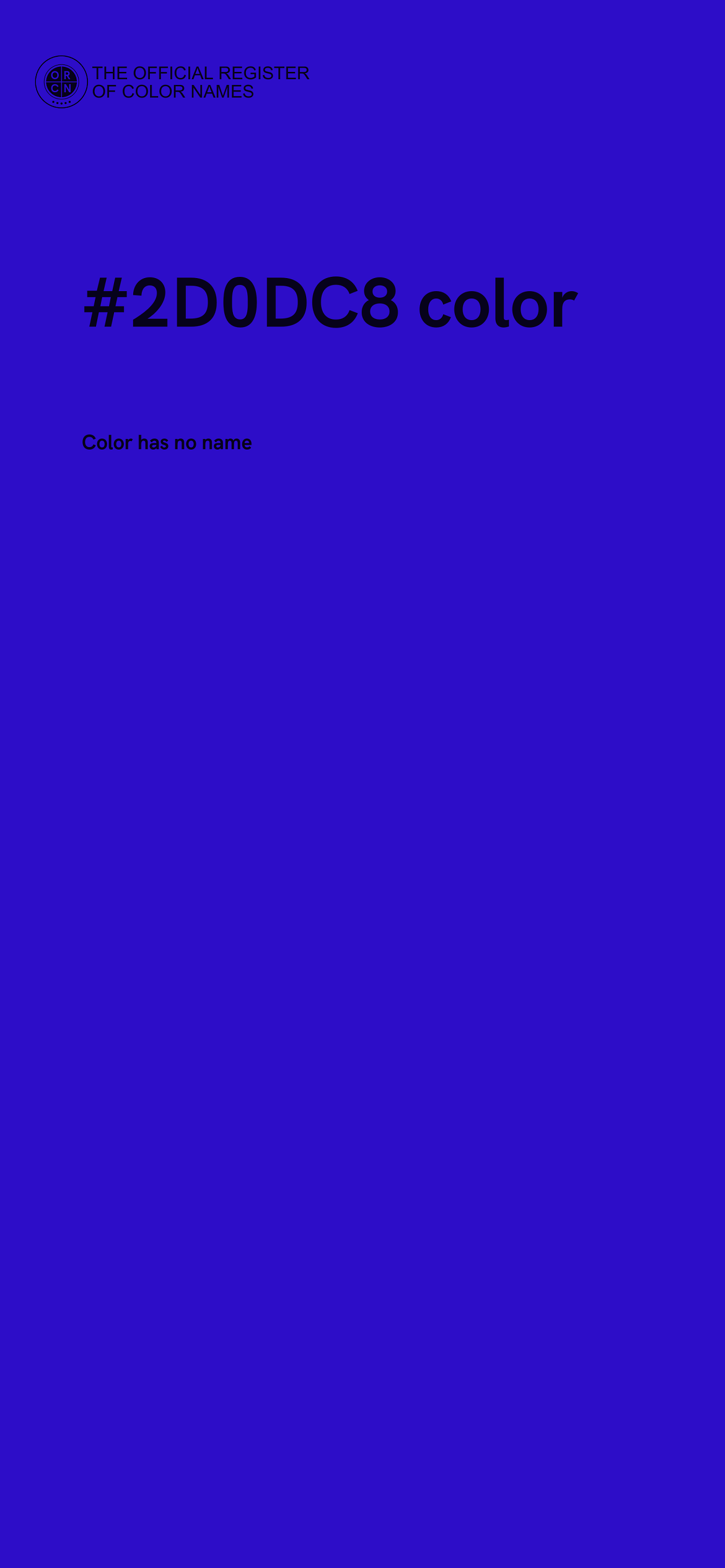 The digital color HEX #2D0DC8 belongs to the Blue Color Family featuring Full Saturation (Saturation Family) and Light (Brightness Family).