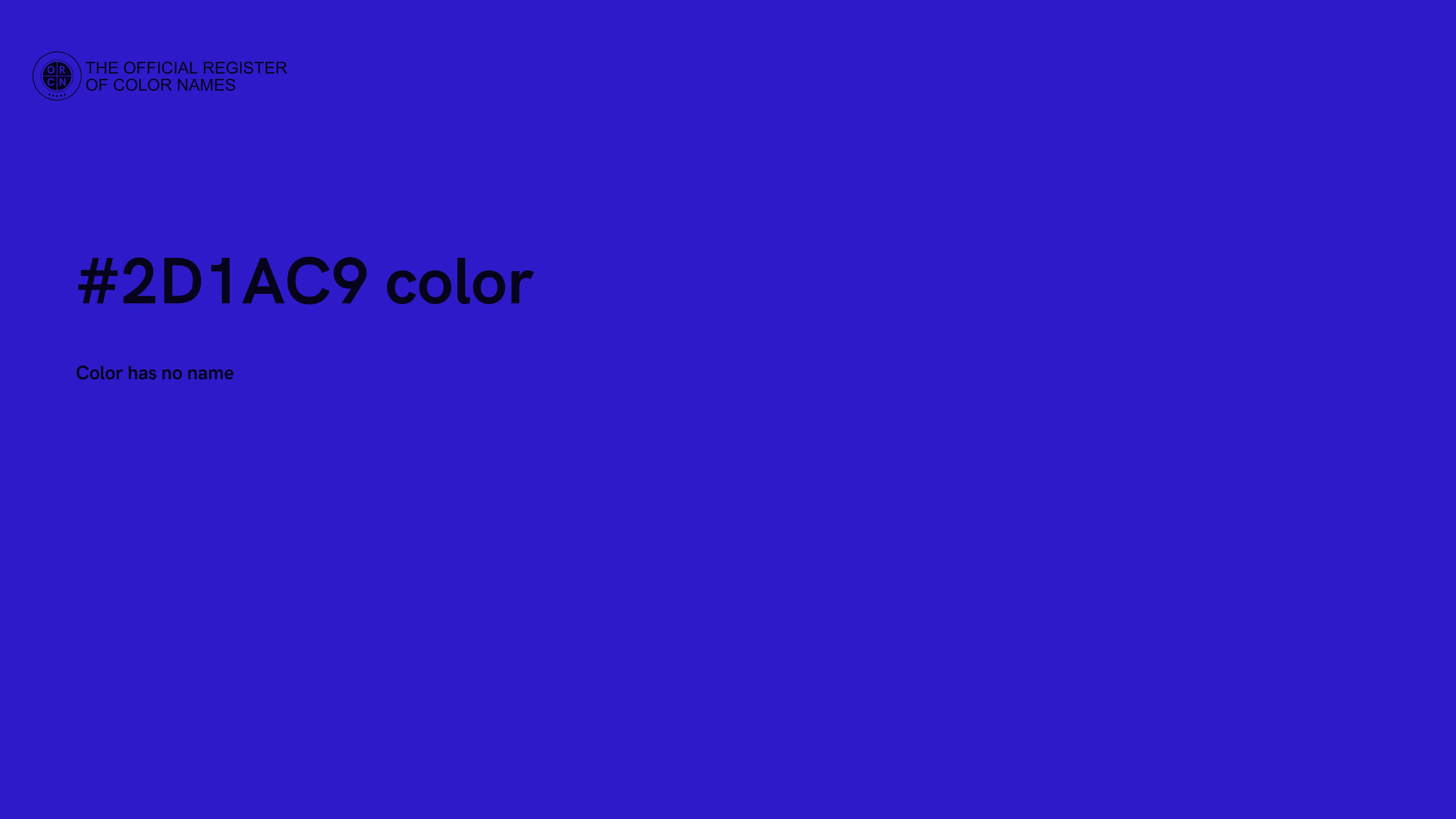 HEX code #2D1AC9 represent the color in hexadecimal format by combining three values – the amounts of Red, Green and Blue (RGB). Its RGB composition is 45, 26, 201 ( rgb(45, 26, 201) ), which breaks down into 17.6% of Red, 10.2% Green and 78.8% Blue.