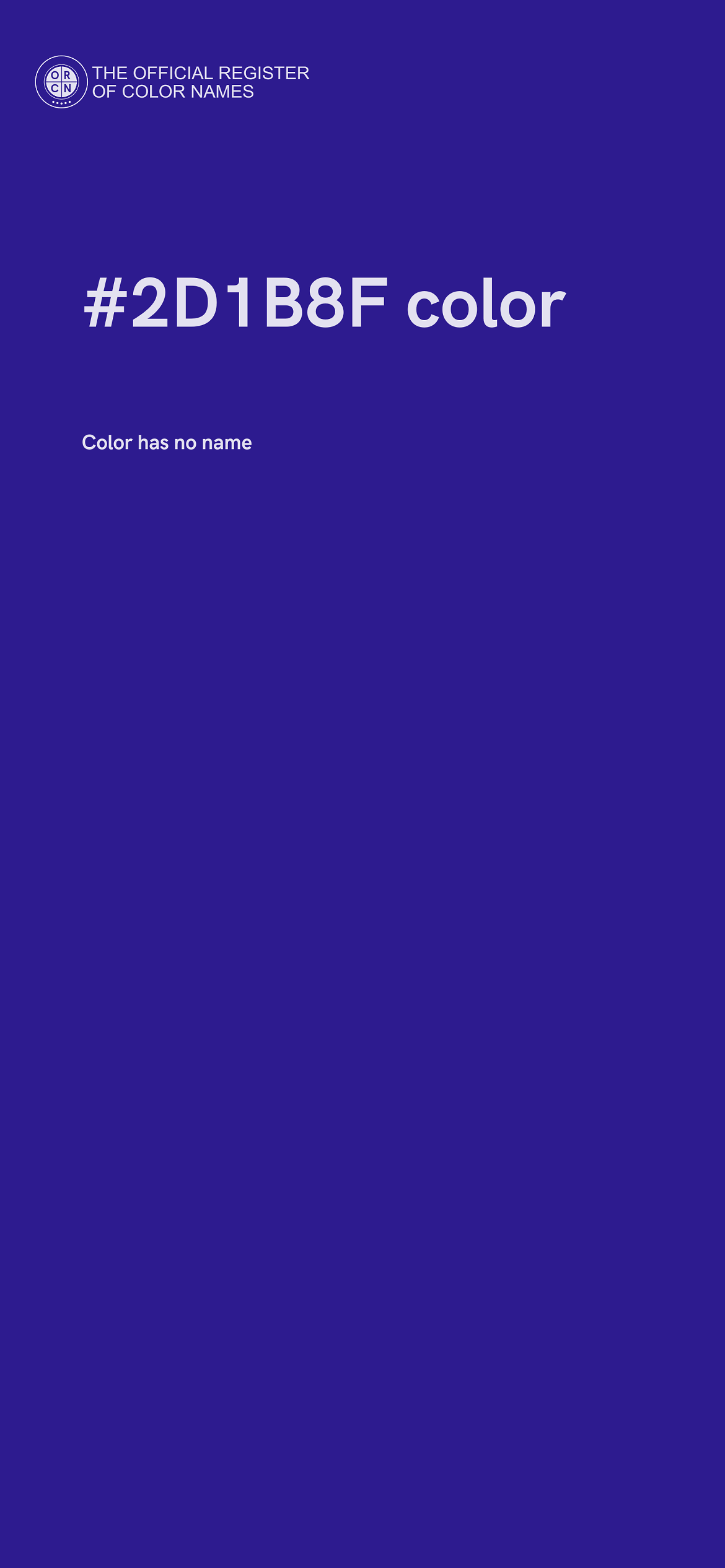 The digital color HEX #2D1B8F belongs to the Blue Color Family featuring High Saturation (Saturation Family) and Neutral (Brightness Family).