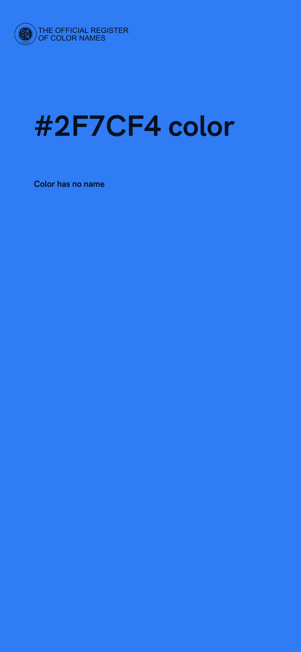 The digital color HEX #2F7CF4 belongs to the Azure Color Family featuring Full Saturation (Saturation Family) and Light (Brightness Family).