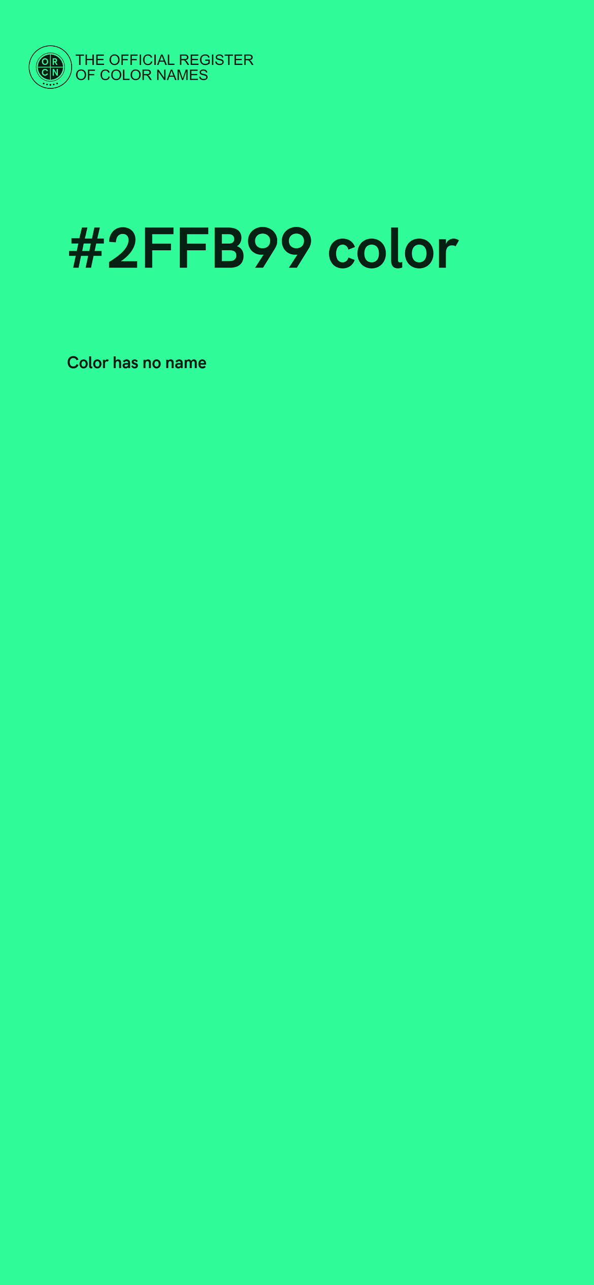 The digital color HEX #2FFB99 belongs to the Spring Green Color Family featuring Full Saturation (Saturation Family) and Light (Brightness Family).
