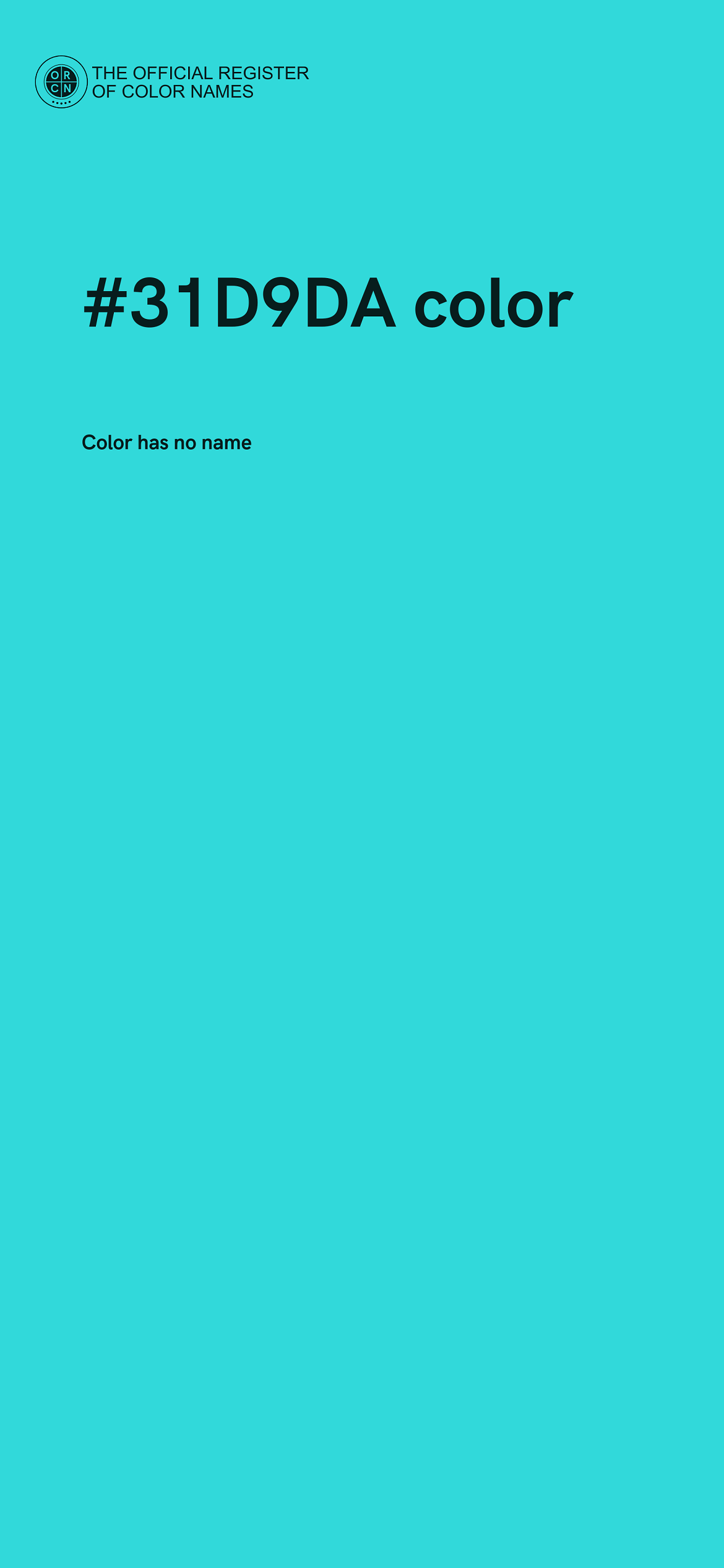 The digital color HEX #31D9DA belongs to the Cyan Color Family featuring High Saturation (Saturation Family) and Light (Brightness Family).