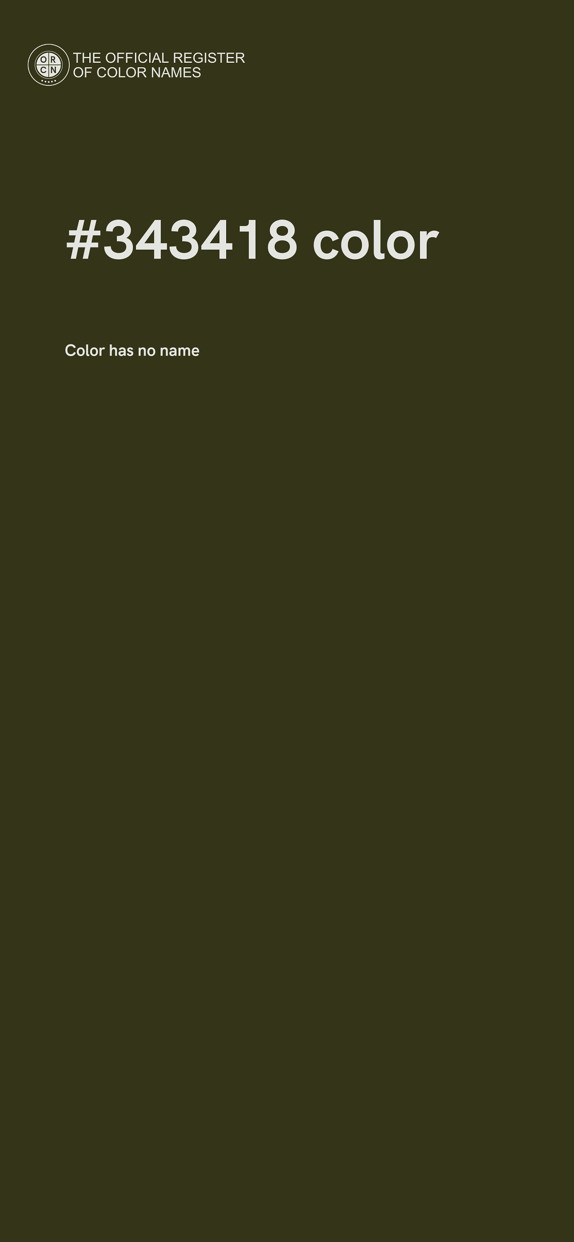 For printing in non digital world, #343418 is represented in CMYK as 0 Cyan, 0 Magenta, 11 Yellow, and 80 Black (Key) (C:0 M:0 Y:11 K:80).