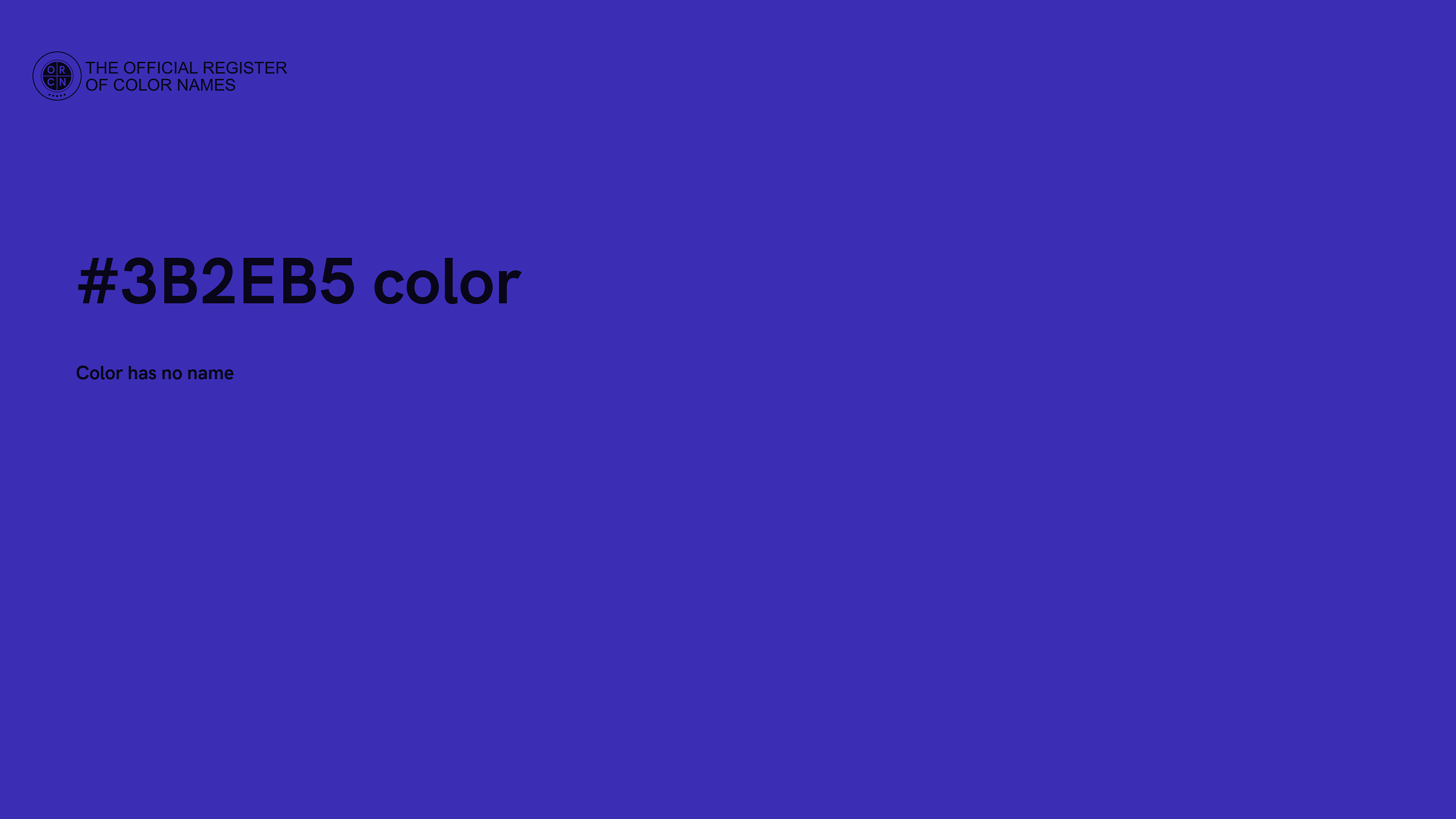 HEX code #3B2EB5 represent the color in hexadecimal format by combining three values – the amounts of Red, Green and Blue (RGB). Its RGB composition is 59, 46, 181 ( rgb(59, 46, 181) ), which breaks down into 23.1% of Red, 18% Green and 71% Blue.