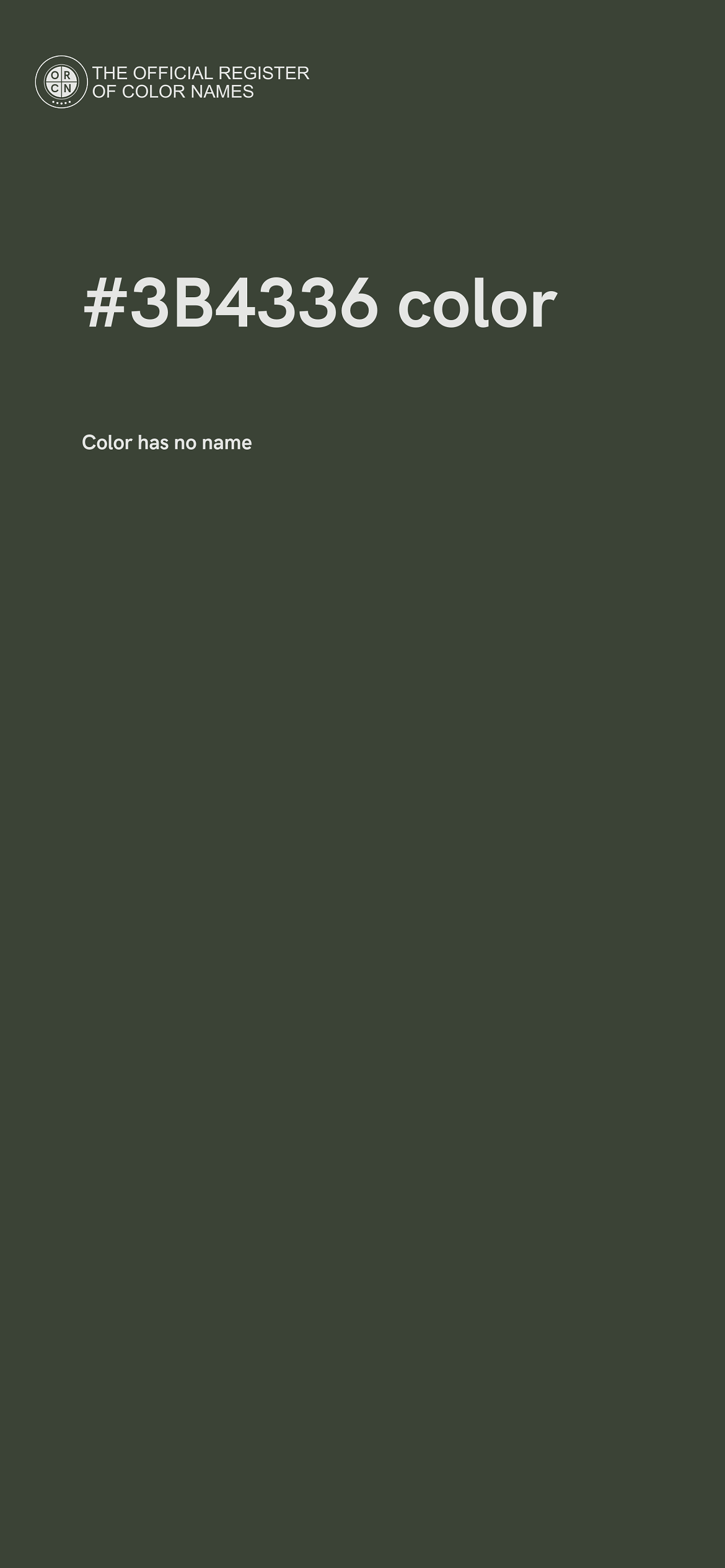 The digital color HEX #3B4336 belongs to the Chartreuse Color Family featuring Low Saturation (Saturation Family) and Dark (Brightness Family).