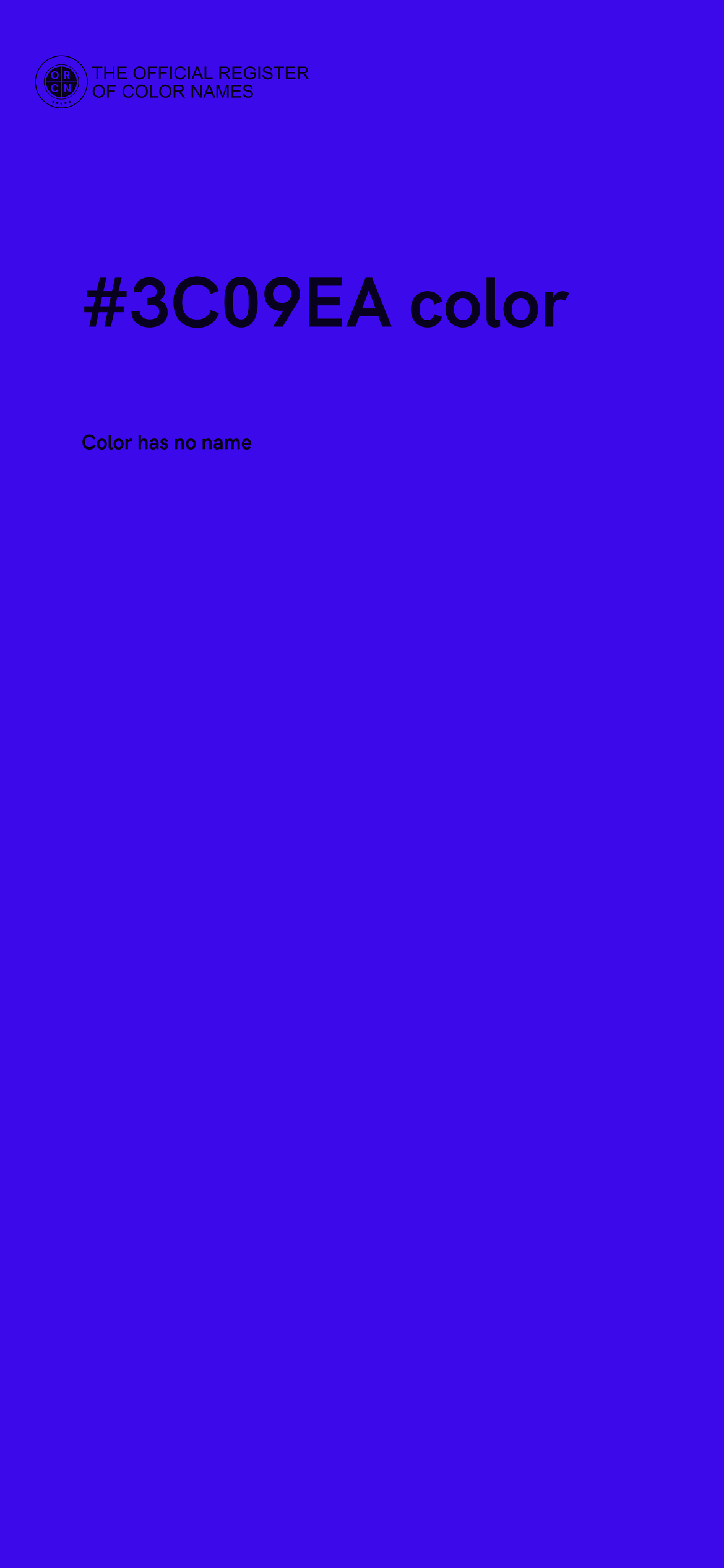 HEX code #3C09EA represent the color in hexadecimal format by combining three values – the amounts of Red, Green and Blue (RGB). Its RGB composition is 60, 9, 234 ( rgb(60, 9, 234) ), which breaks down into 23.5% of Red, 3.5% Green and 91.8% Blue.