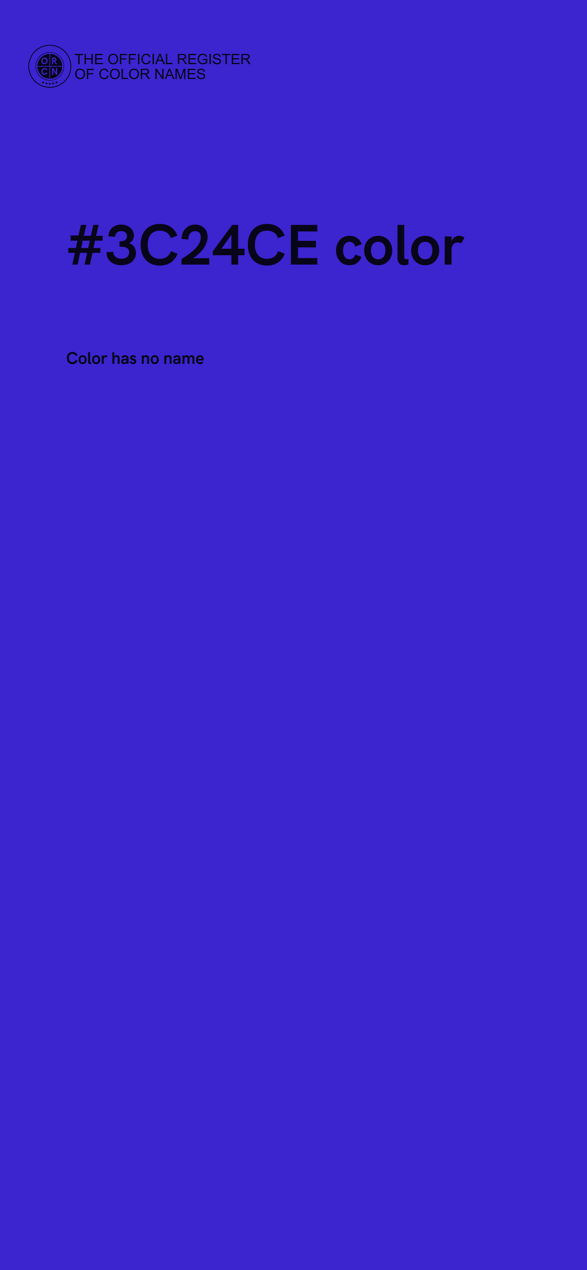 For printing in non digital world, #3C24CE is represented in CMYK as 57 Cyan, 67 Magenta, 0 Yellow, and 19 Black (Key) (C:57 M:67 Y:0 K:19).