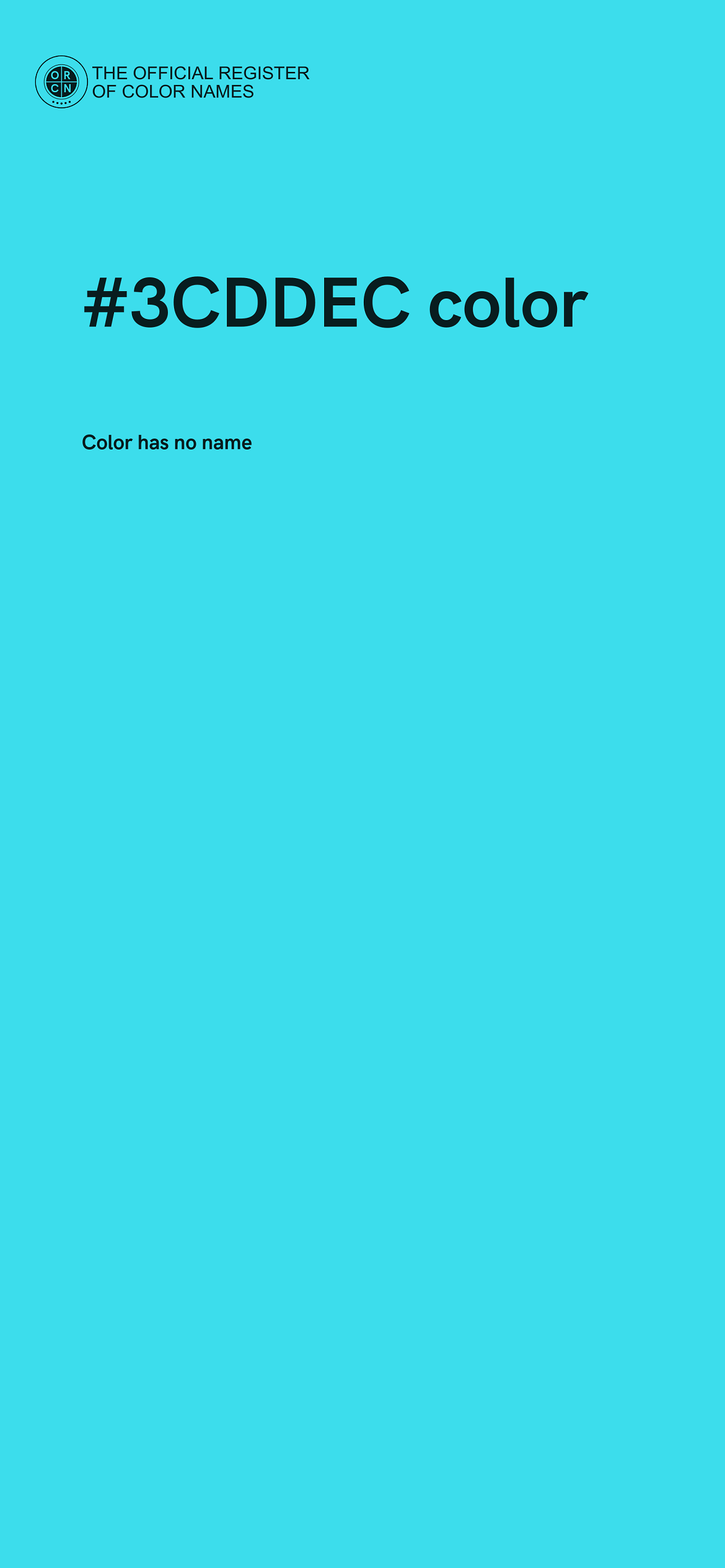 For printing in non digital world, #3CDDEC is represented in CMYK as 69 Cyan, 6 Magenta, 0 Yellow, and 7 Black (Key) (C:69 M:6 Y:0 K:7).