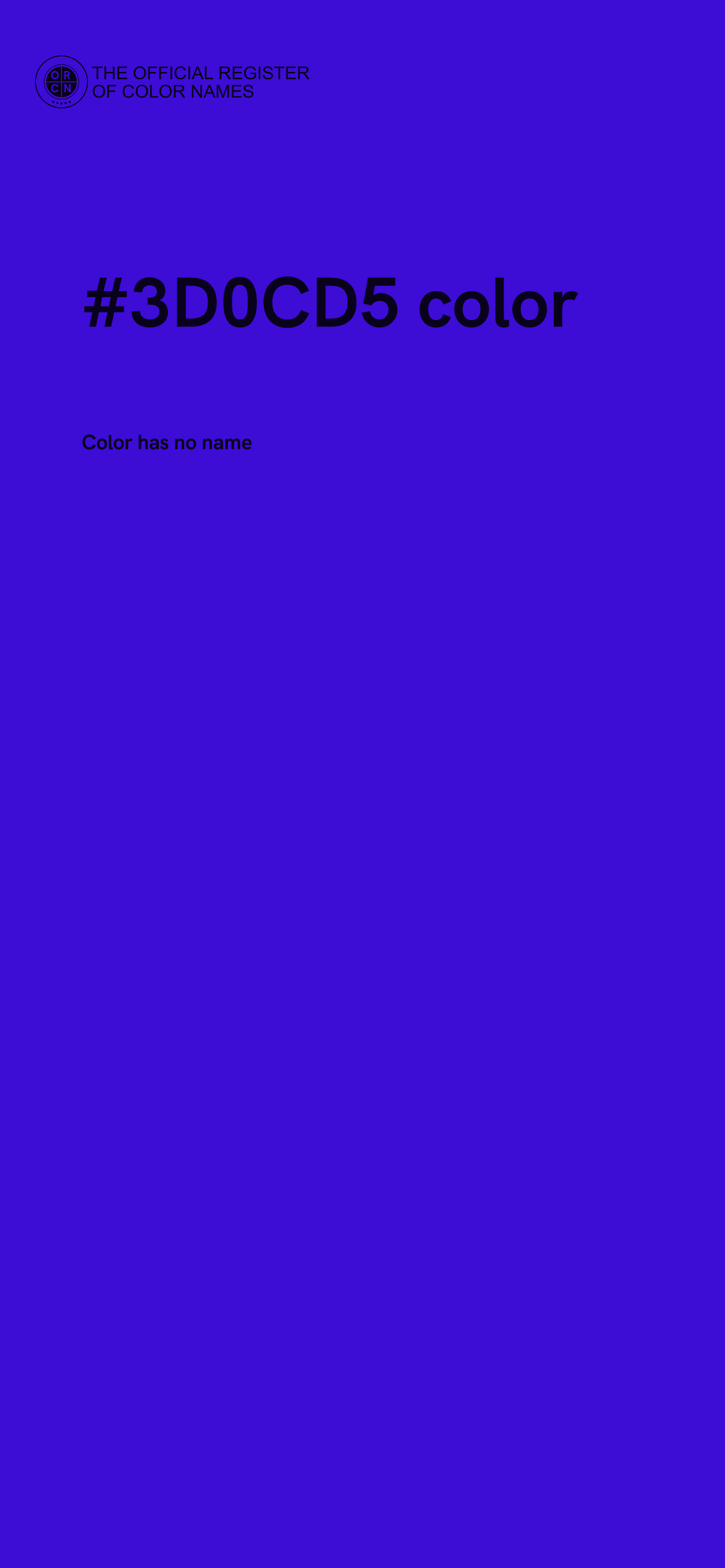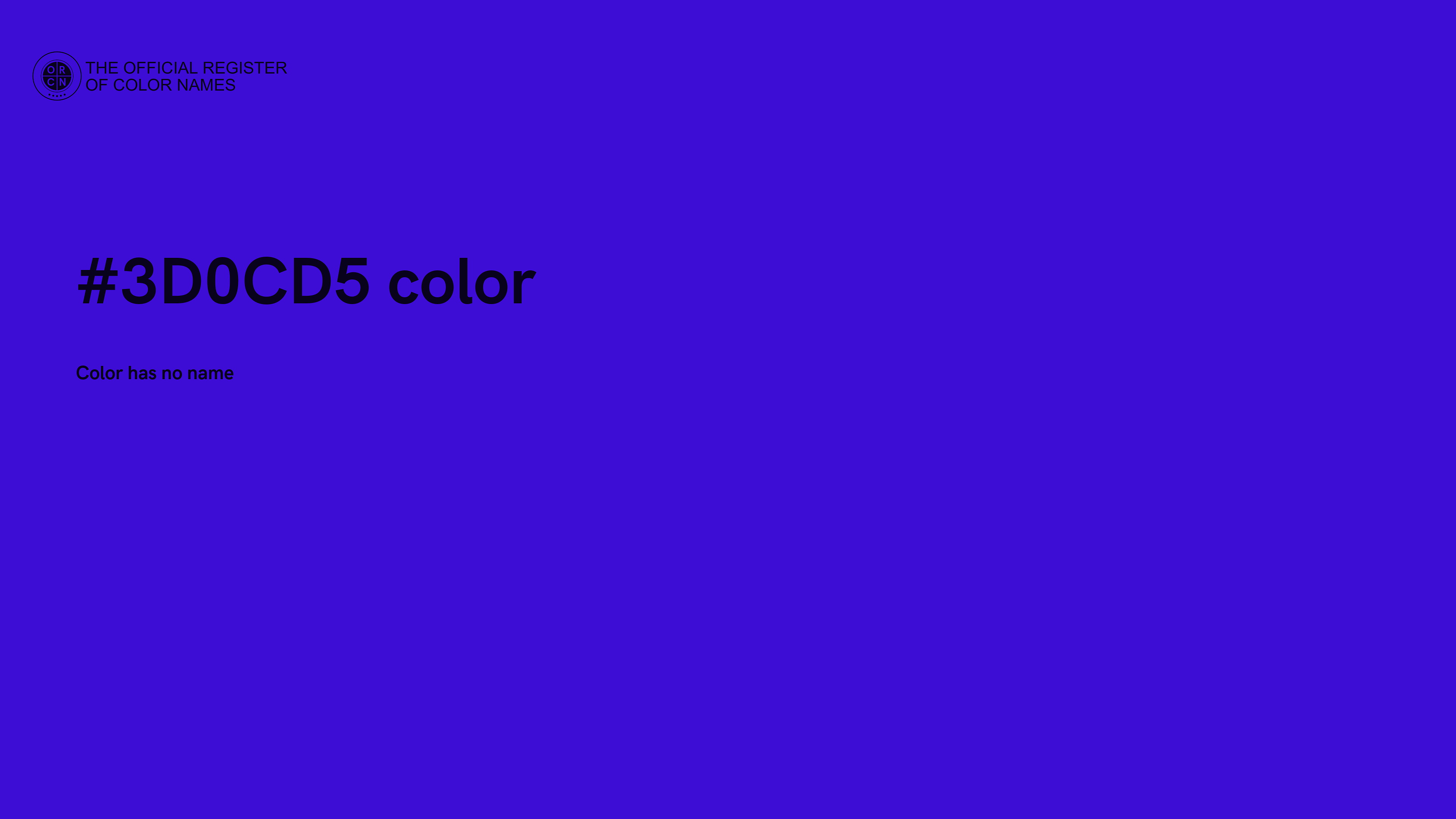 For printing in non digital world, #3D0CD5 is represented in CMYK as 60 Cyan, 79 Magenta, 0 Yellow, and 16 Black (Key) (C:60 M:79 Y:0 K:16).