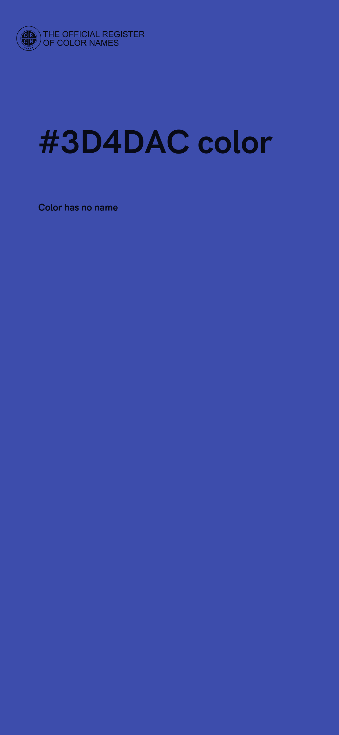 For printing in non digital world, #3D4DAC is represented in CMYK as 44 Cyan, 37 Magenta, 0 Yellow, and 33 Black (Key) (C:44 M:37 Y:0 K:33).