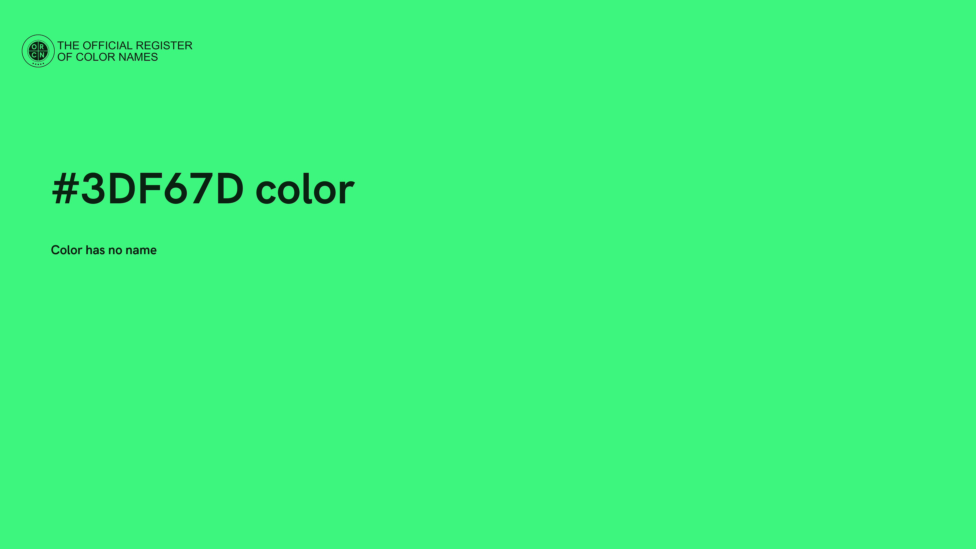 The digital color HEX #3DF67D belongs to the Spring Green Color Family featuring Full Saturation (Saturation Family) and Very Light (Brightness Family).