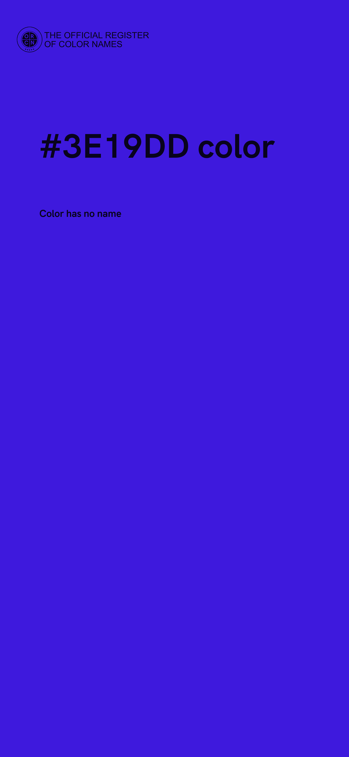 The digital color HEX #3E19DD belongs to the Blue Color Family featuring High Saturation (Saturation Family) and Light (Brightness Family).