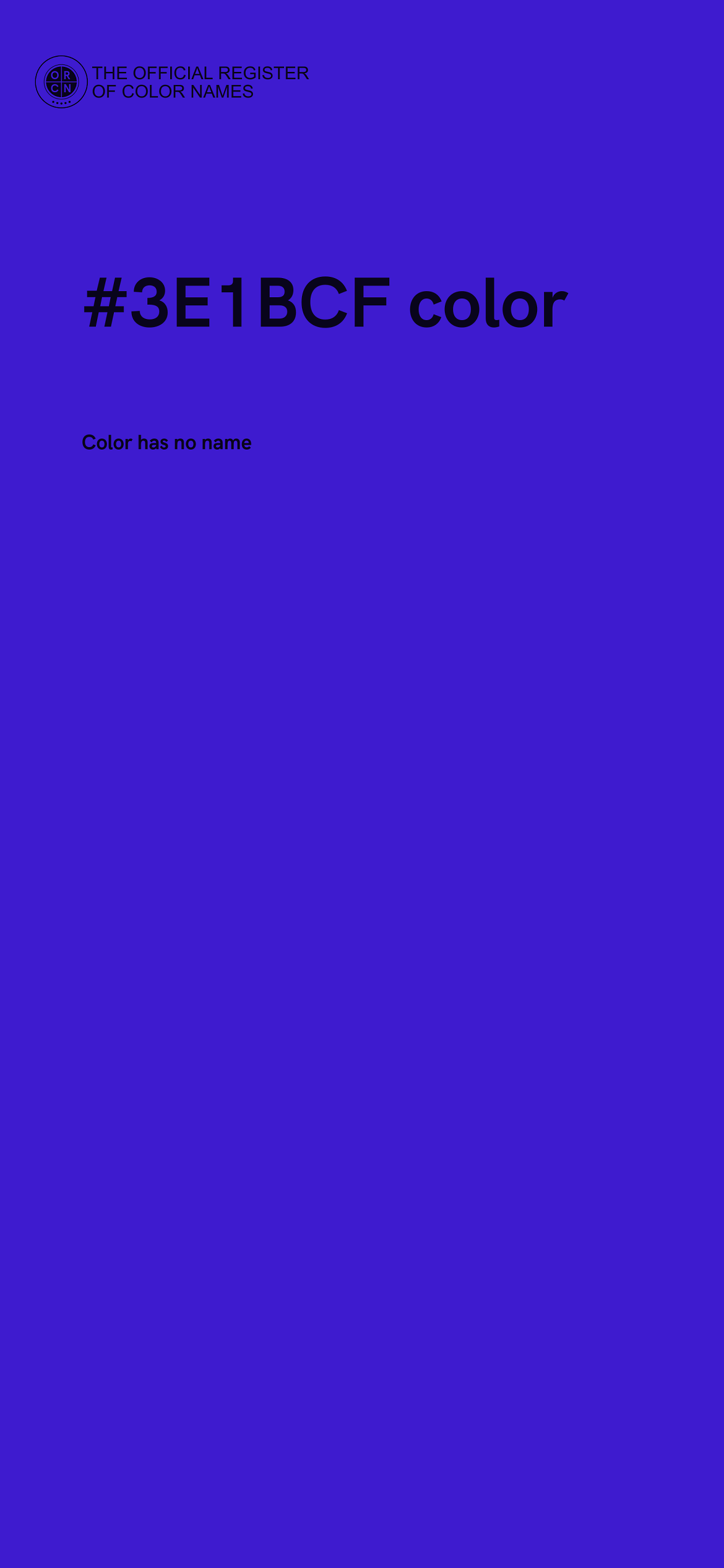 For printing in non digital world, #3E1BCF is represented in CMYK as 57 Cyan, 71 Magenta, 0 Yellow, and 19 Black (Key) (C:57 M:71 Y:0 K:19).