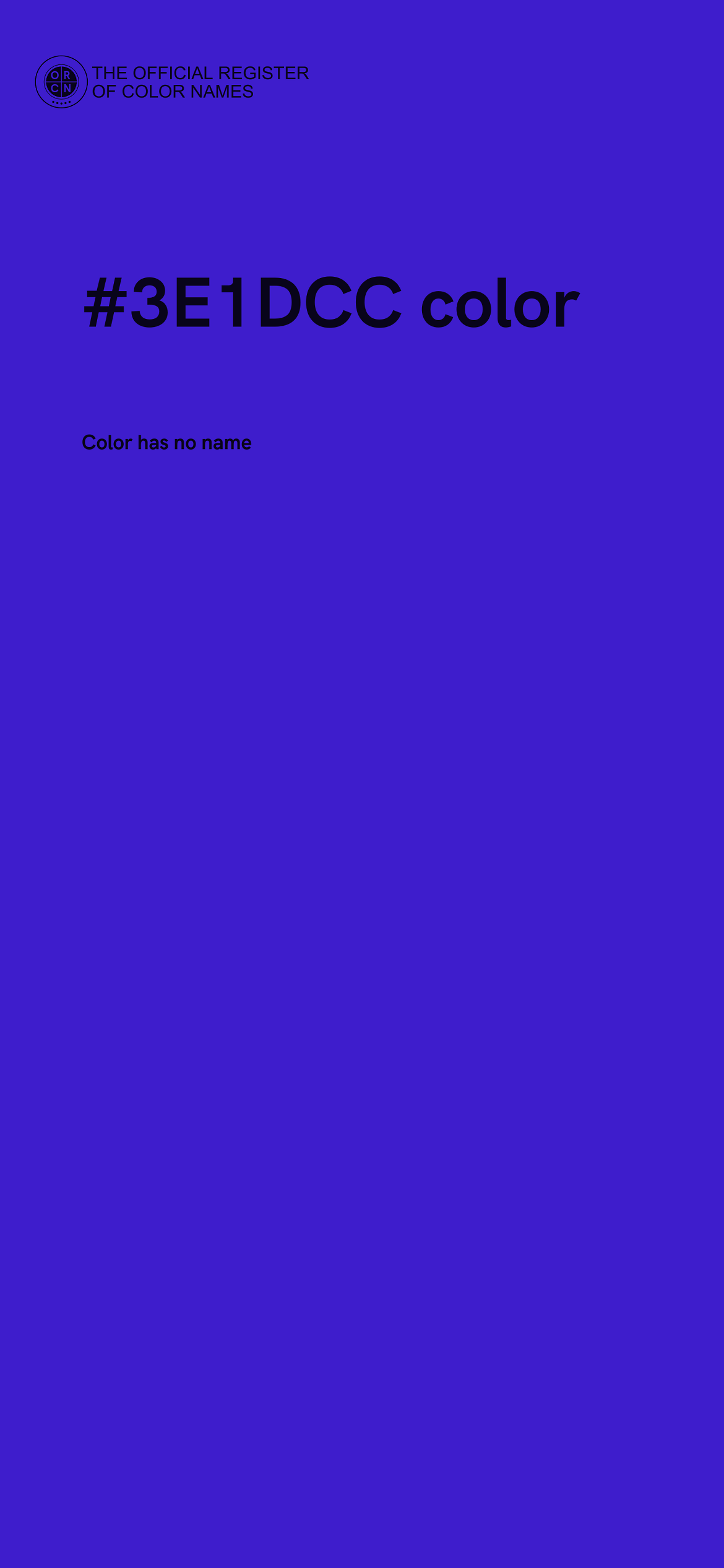 The digital color HEX #3E1DCC belongs to the Blue Color Family featuring High Saturation (Saturation Family) and Light (Brightness Family).