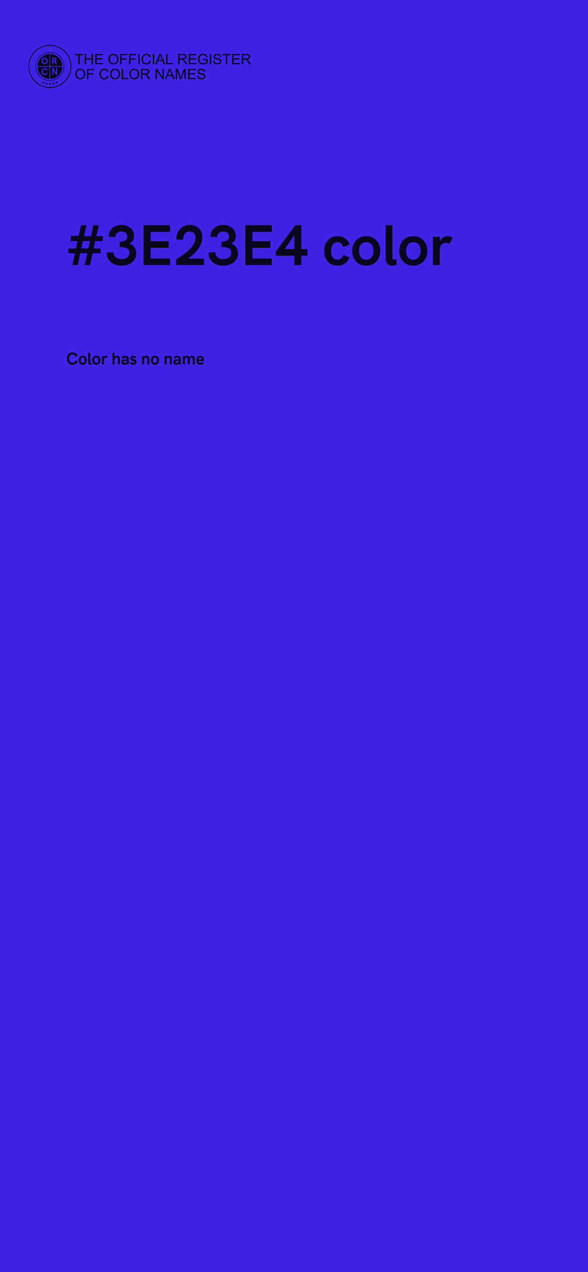 The digital color HEX #3E23E4 belongs to the Blue Color Family featuring High Saturation (Saturation Family) and Light (Brightness Family).