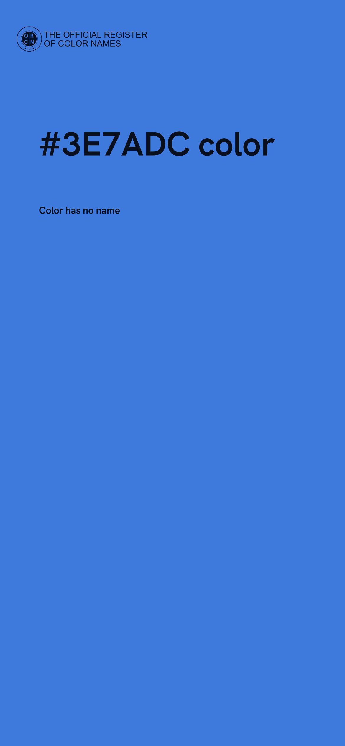 The digital color HEX #3E7ADC belongs to the Azure Color Family featuring High Saturation (Saturation Family) and Light (Brightness Family).