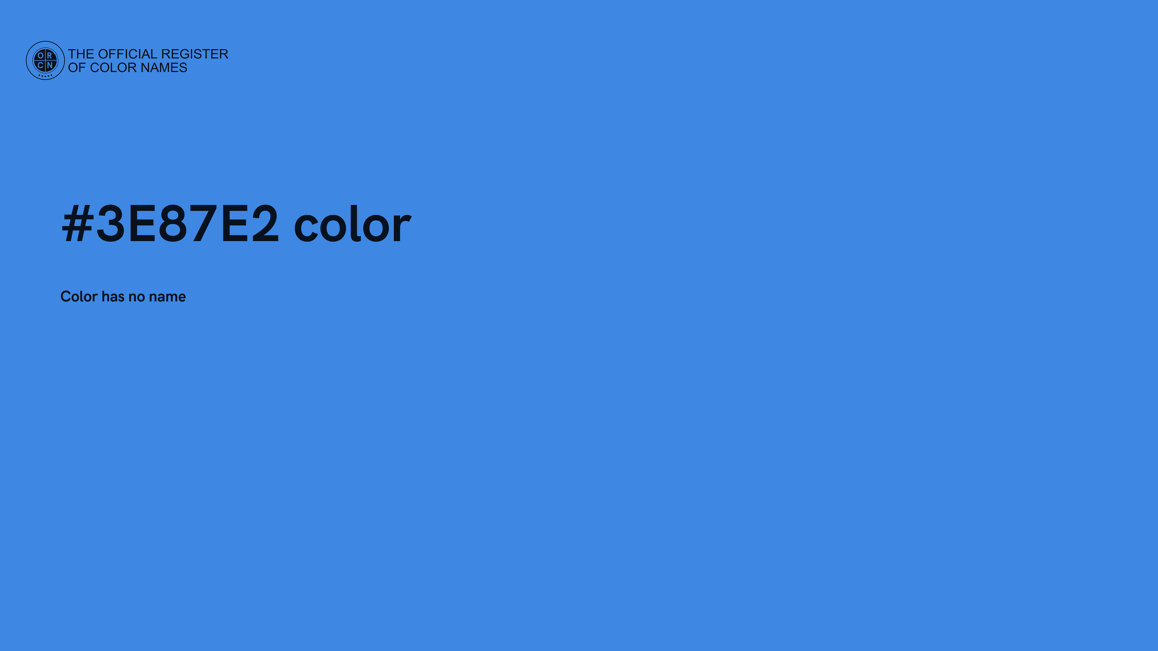 The digital color HEX #3E87E2 belongs to the Azure Color Family featuring High Saturation (Saturation Family) and Light (Brightness Family).