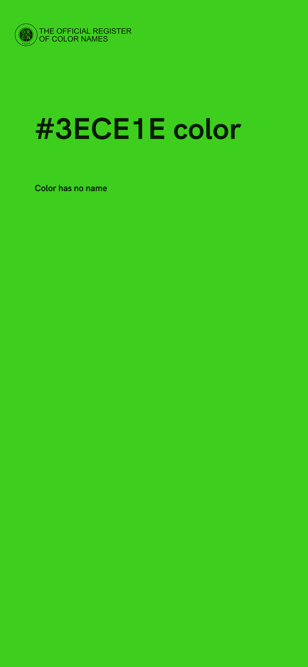 The digital color HEX #3ECE1E belongs to the Green Color Family featuring High Saturation (Saturation Family) and Light (Brightness Family).