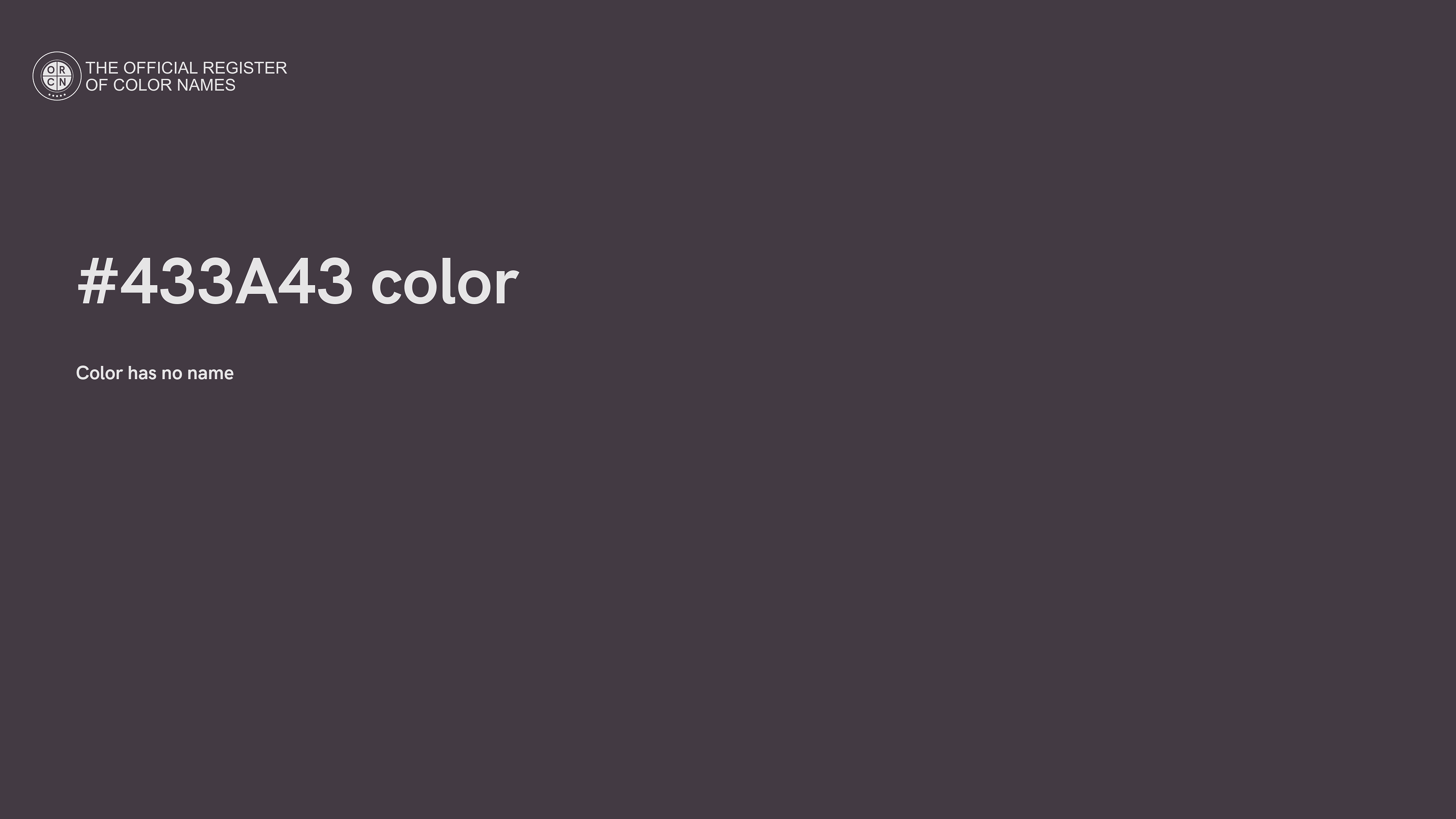 For printing in non digital world, #433A43 is represented in CMYK as 0 Cyan, 4 Magenta, 0 Yellow, and 74 Black (Key) (C:0 M:4 Y:0 K:74).