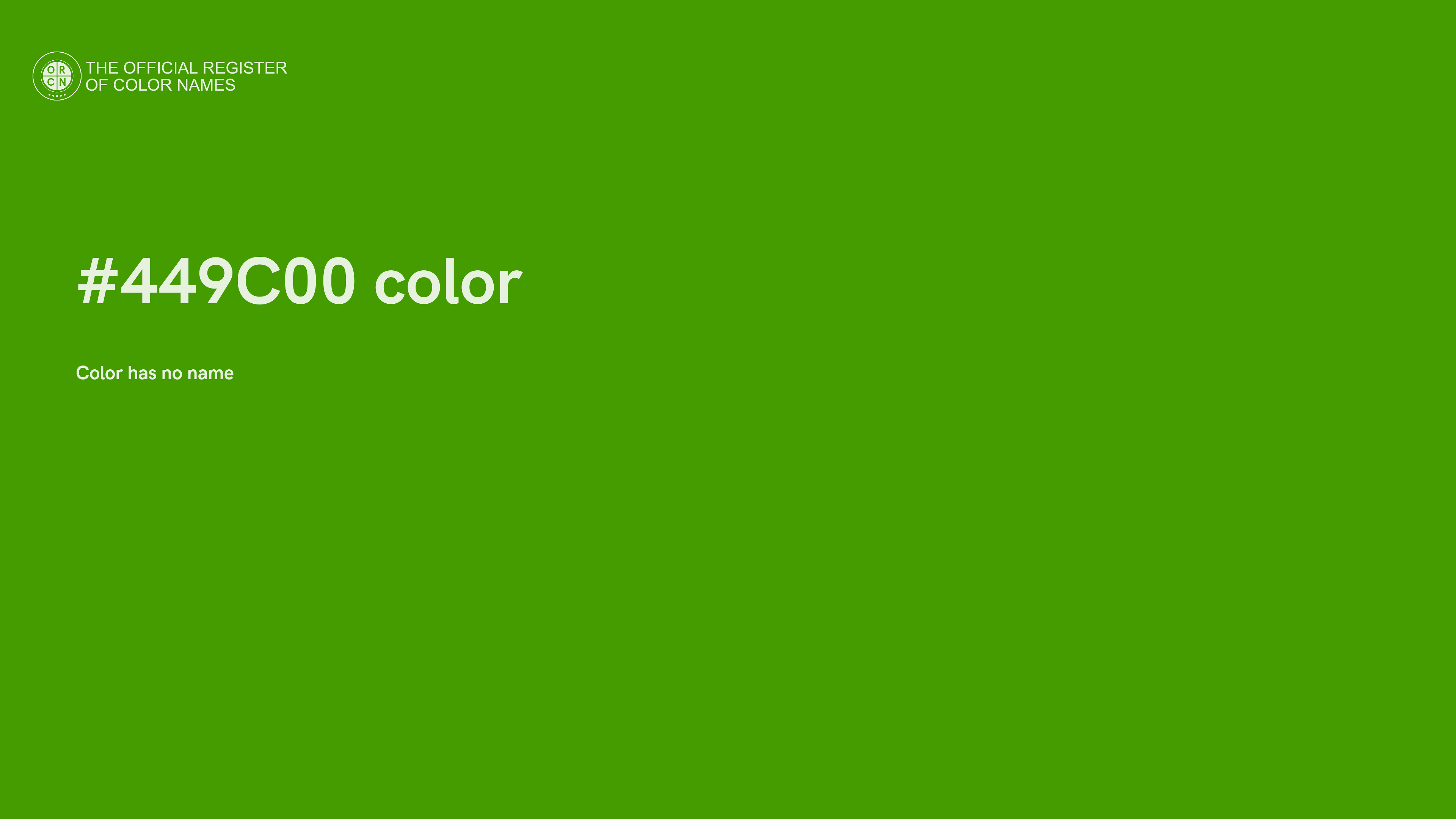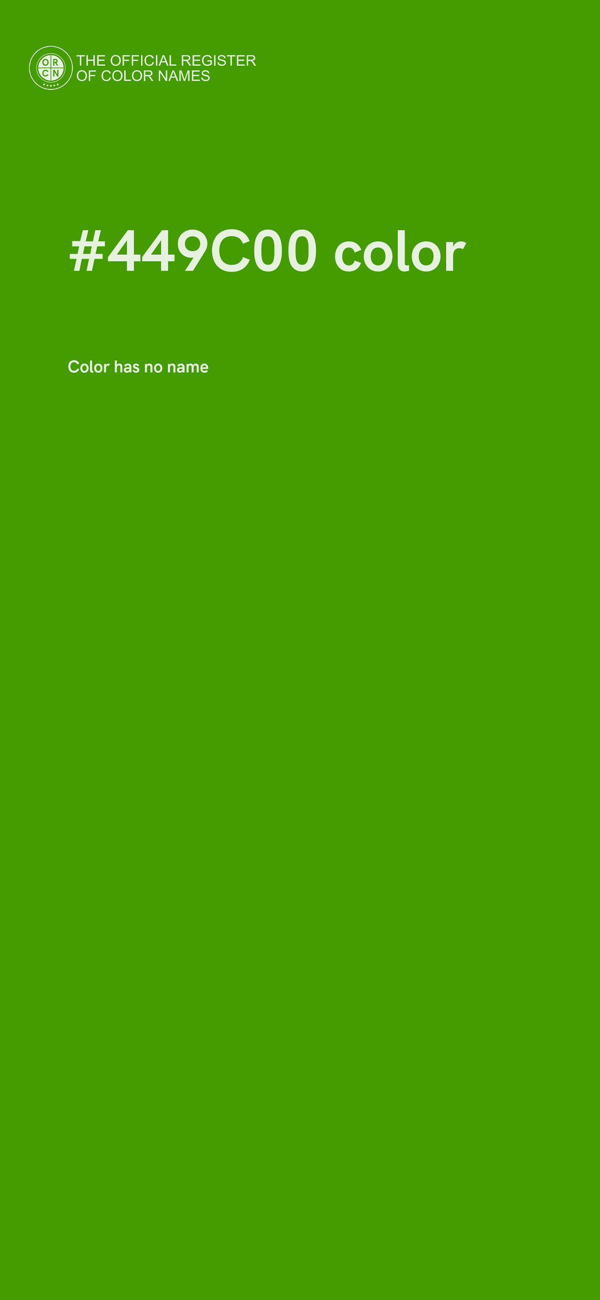 The digital color HEX #449C00 belongs to the Chartreuse Color Family featuring Full Saturation (Saturation Family) and Neutral (Brightness Family).