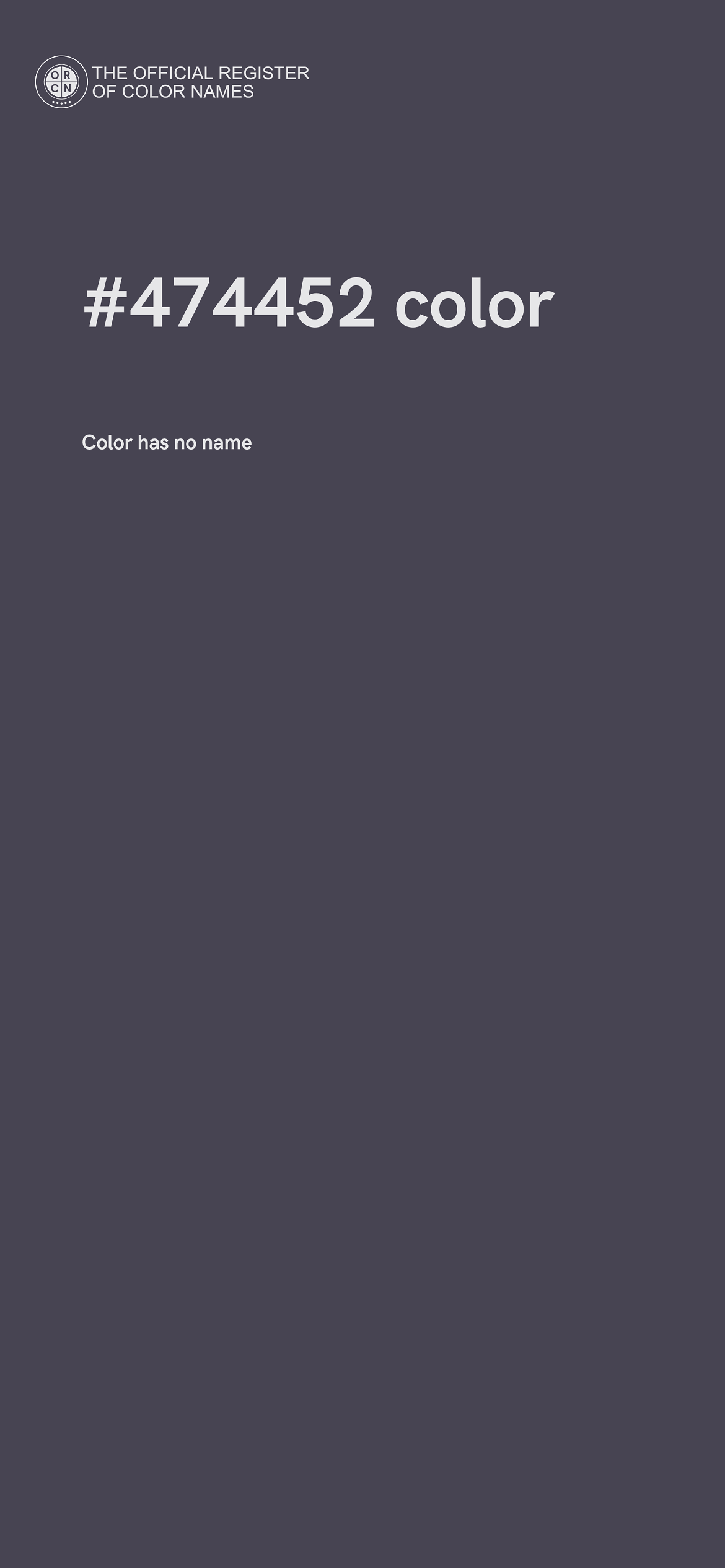 The digital color HEX #474452 belongs to the Blue Color Family featuring Desaturated (Saturation Family) and Neutral (Brightness Family).
