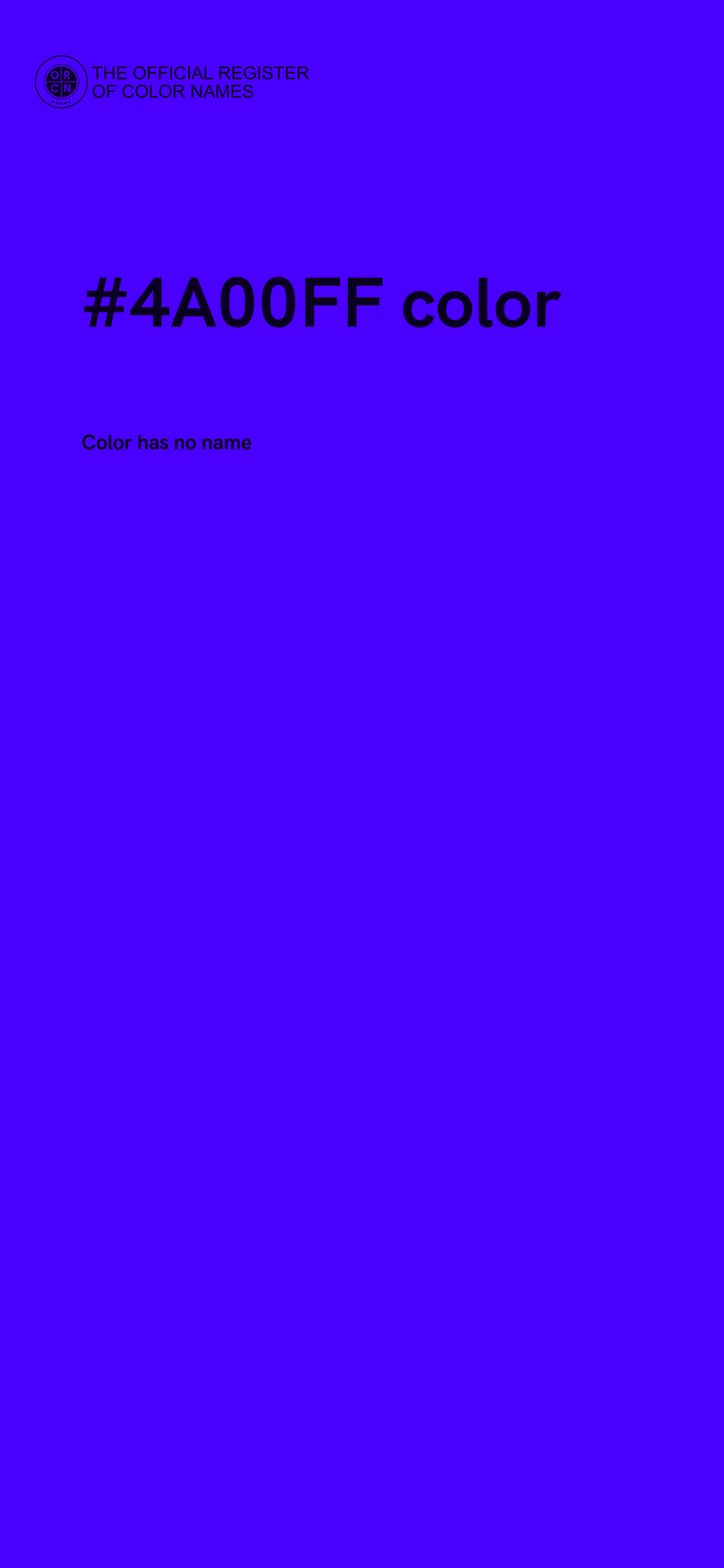 The digital color HEX #4A00FF belongs to the Violet Color Family featuring Full Saturation (Saturation Family) and Light (Brightness Family).