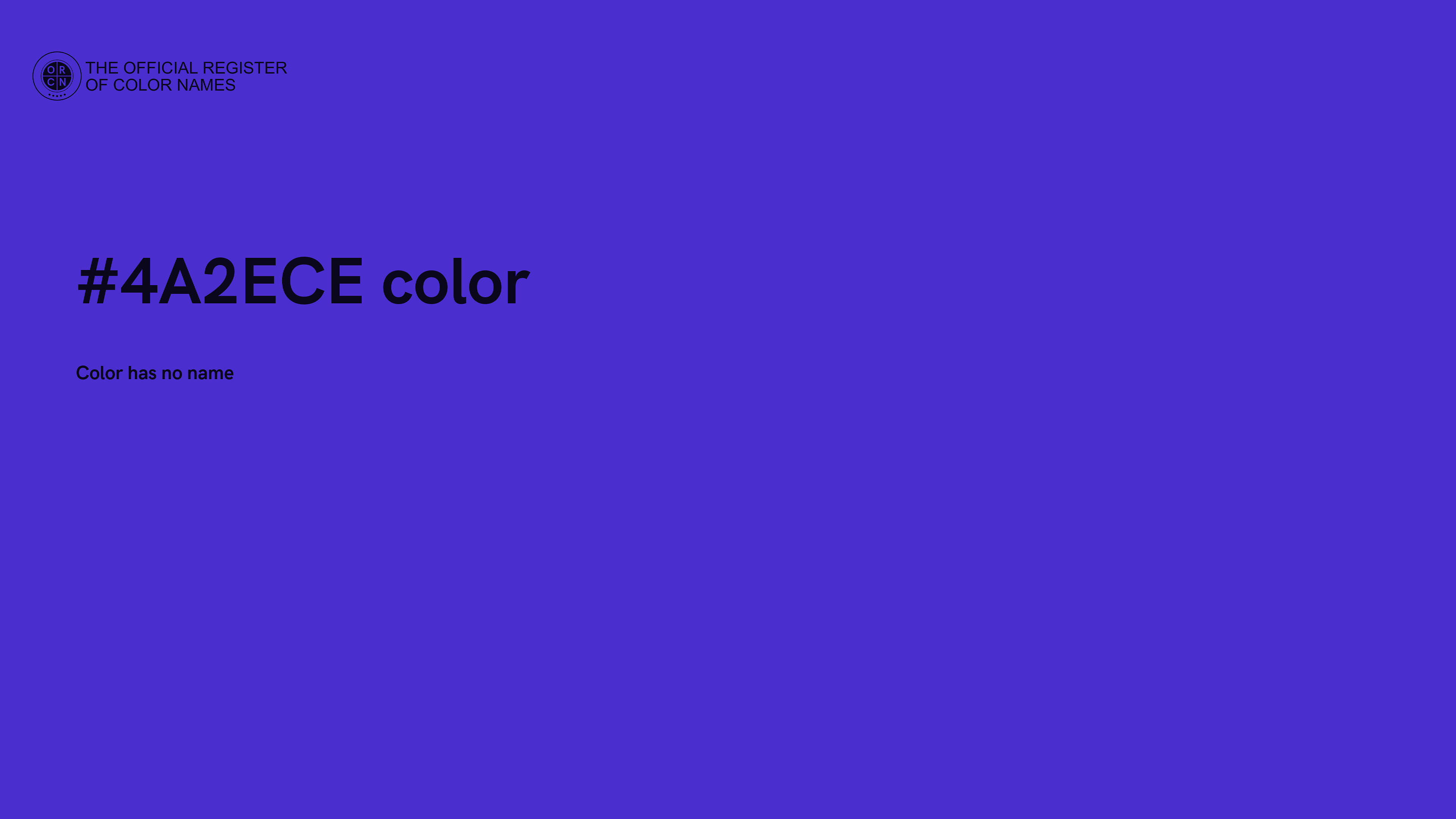 HEX code #4A2ECE represent the color in hexadecimal format by combining three values – the amounts of Red, Green and Blue (RGB). Its RGB composition is 74, 46, 206 ( rgb(74, 46, 206) ), which breaks down into 29% of Red, 18% Green and 80.8% Blue.