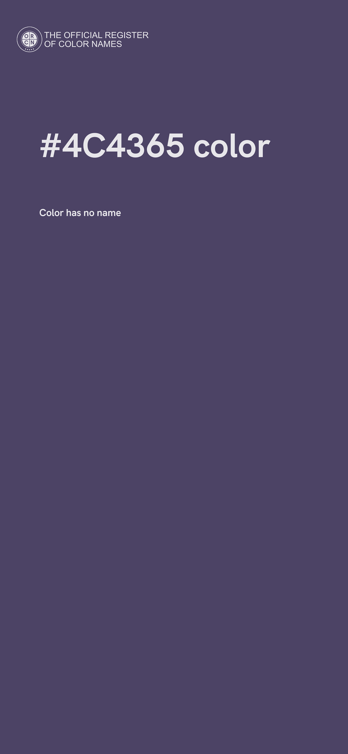 The digital color HEX #4C4365 belongs to the Violet Color Family featuring Low Saturation (Saturation Family) and Neutral (Brightness Family).