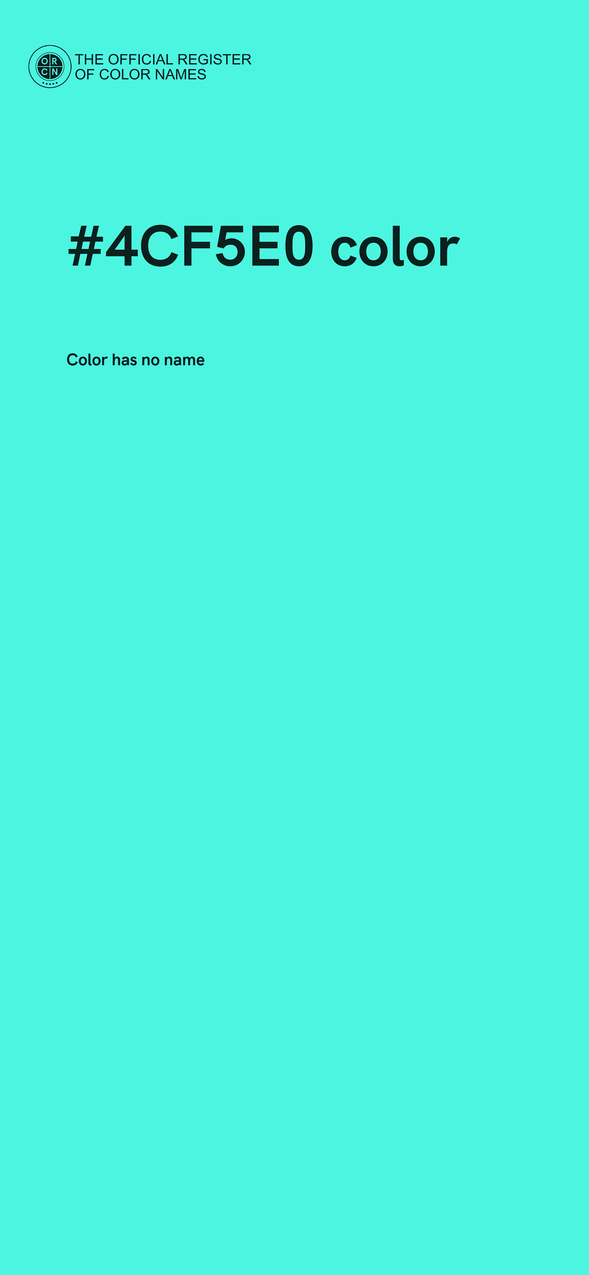 The digital color HEX #4CF5E0 belongs to the Cyan Color Family featuring Full Saturation (Saturation Family) and Very Light (Brightness Family).