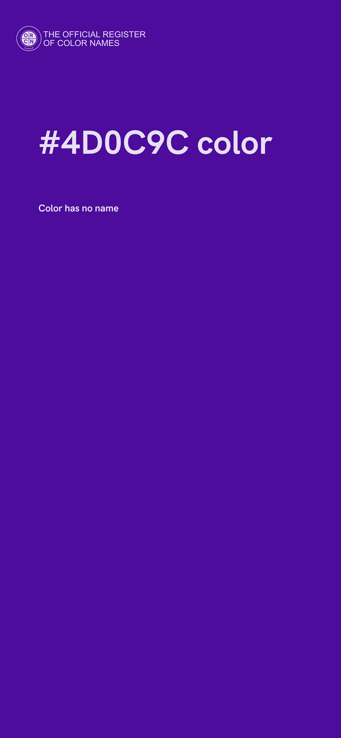 For printing in non digital world, #4D0C9C is represented in CMYK as 31 Cyan, 56 Magenta, 0 Yellow, and 39 Black (Key) (C:31 M:56 Y:0 K:39).