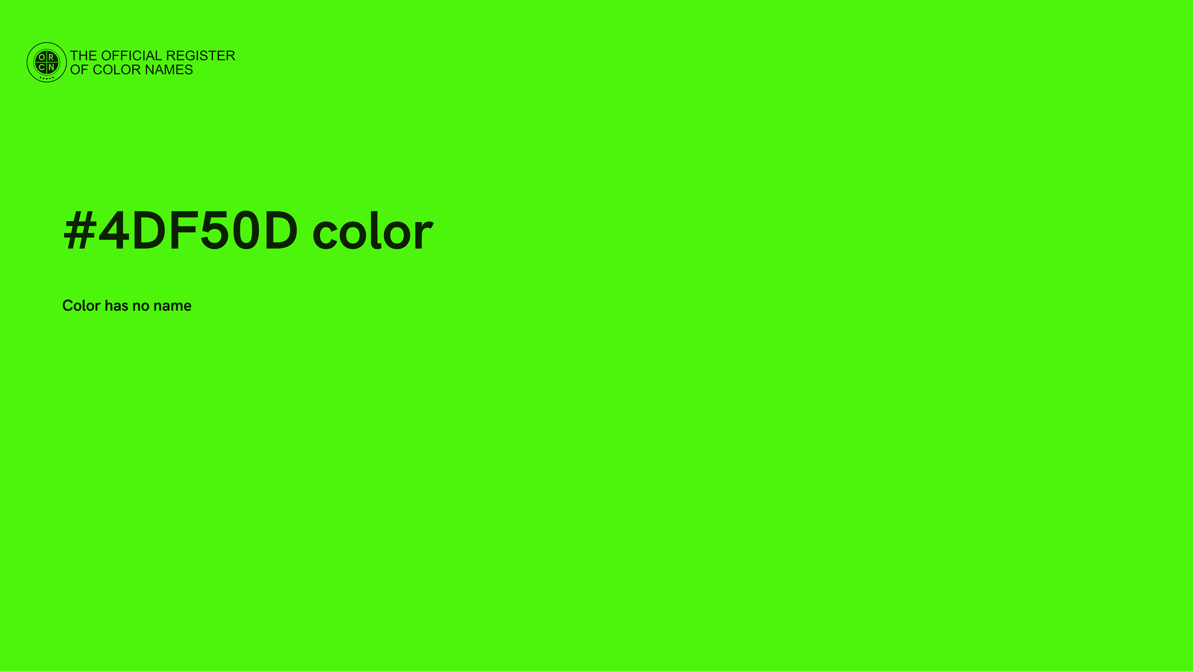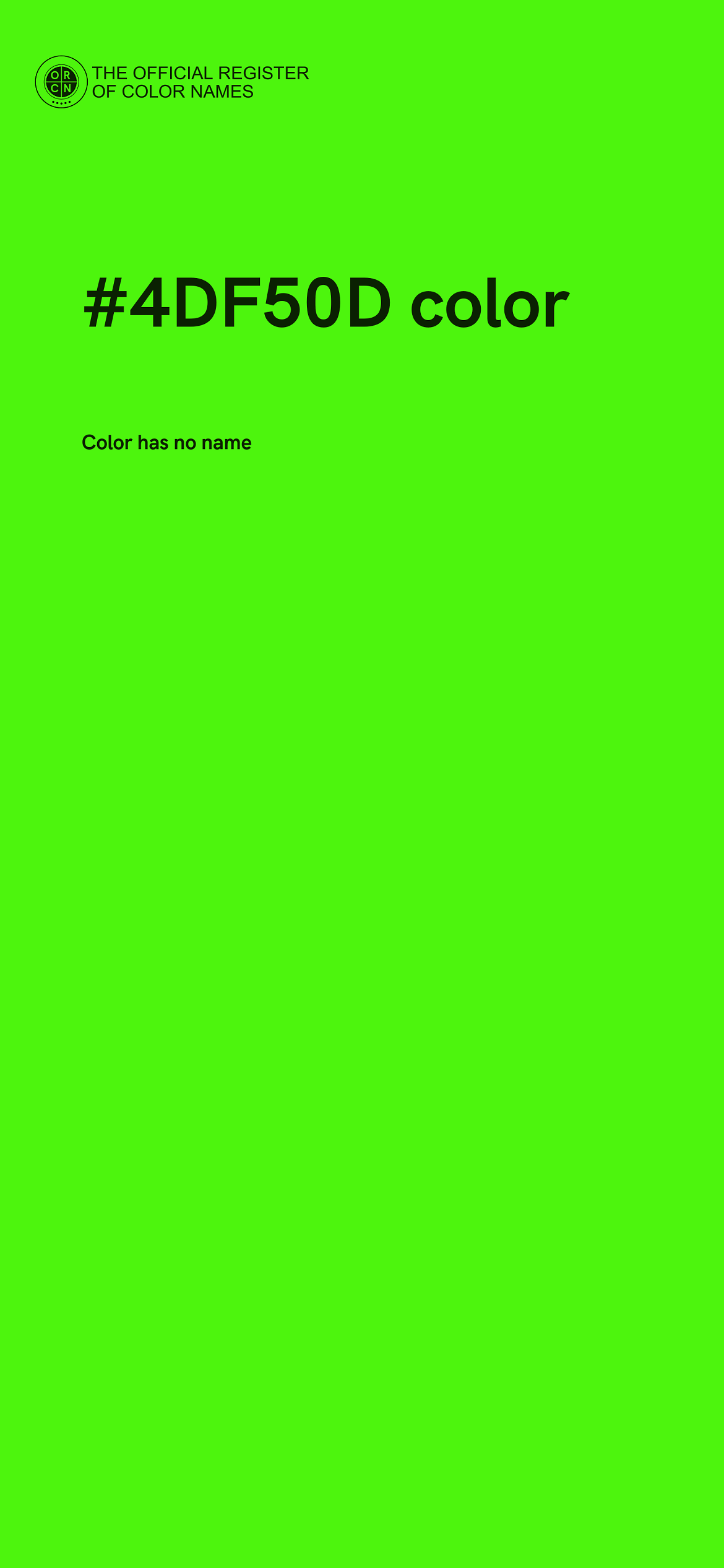 The digital color HEX #4DF50D belongs to the Chartreuse Color Family featuring Full Saturation (Saturation Family) and Light (Brightness Family).