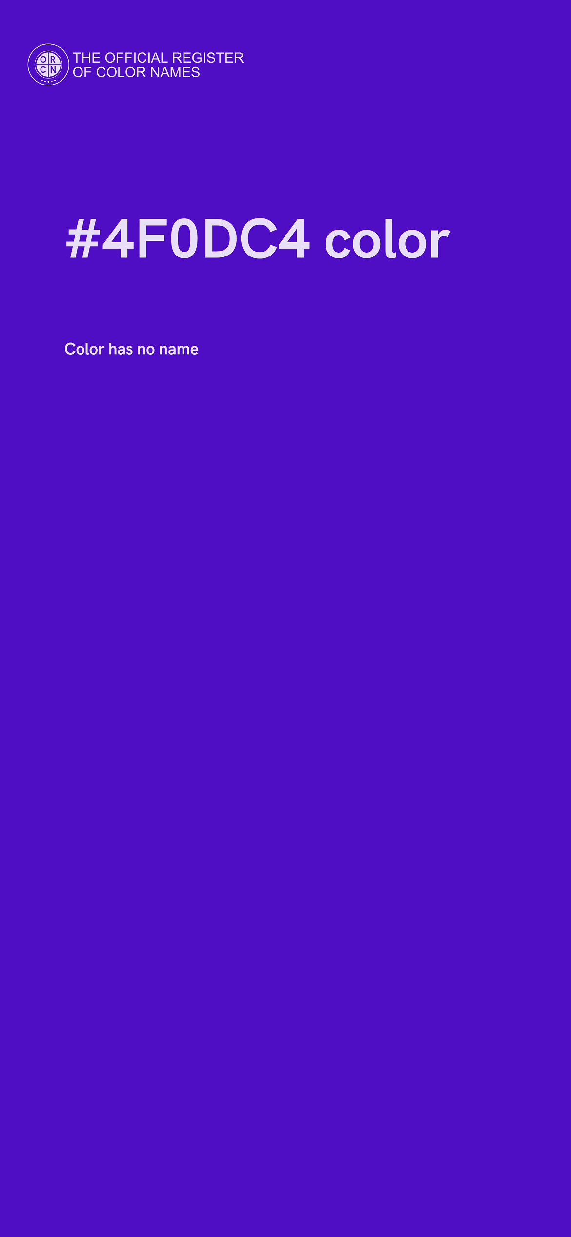 For printing in non digital world, #4F0DC4 is represented in CMYK as 46 Cyan, 72 Magenta, 0 Yellow, and 23 Black (Key) (C:46 M:72 Y:0 K:23).