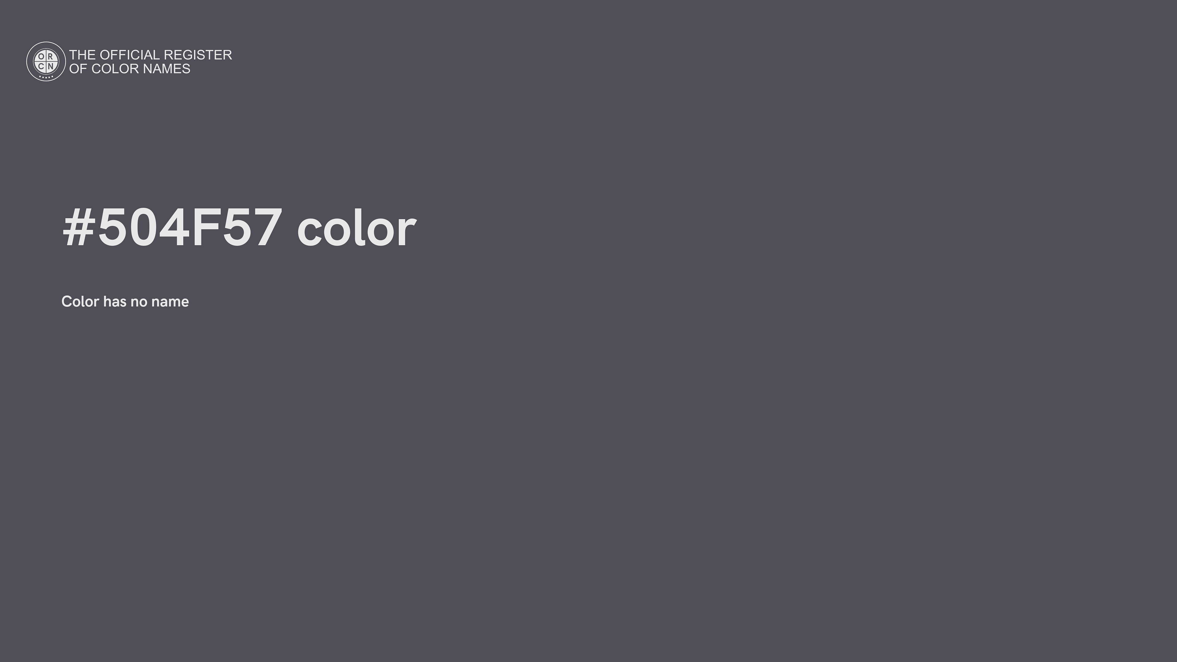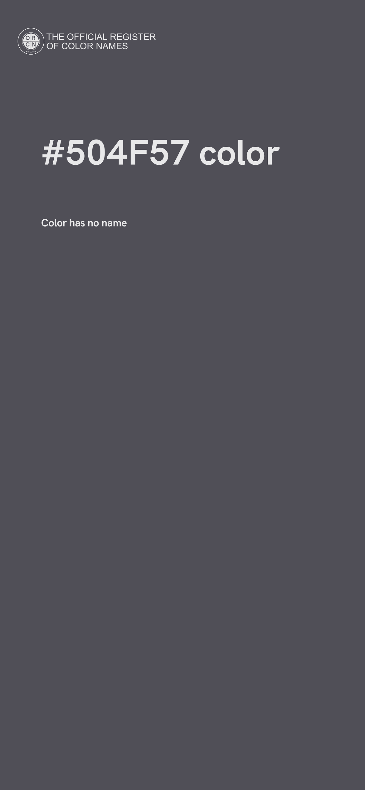 The digital color HEX #504F57 belongs to the Blue Color Family featuring Desaturated (Saturation Family) and Neutral (Brightness Family).
